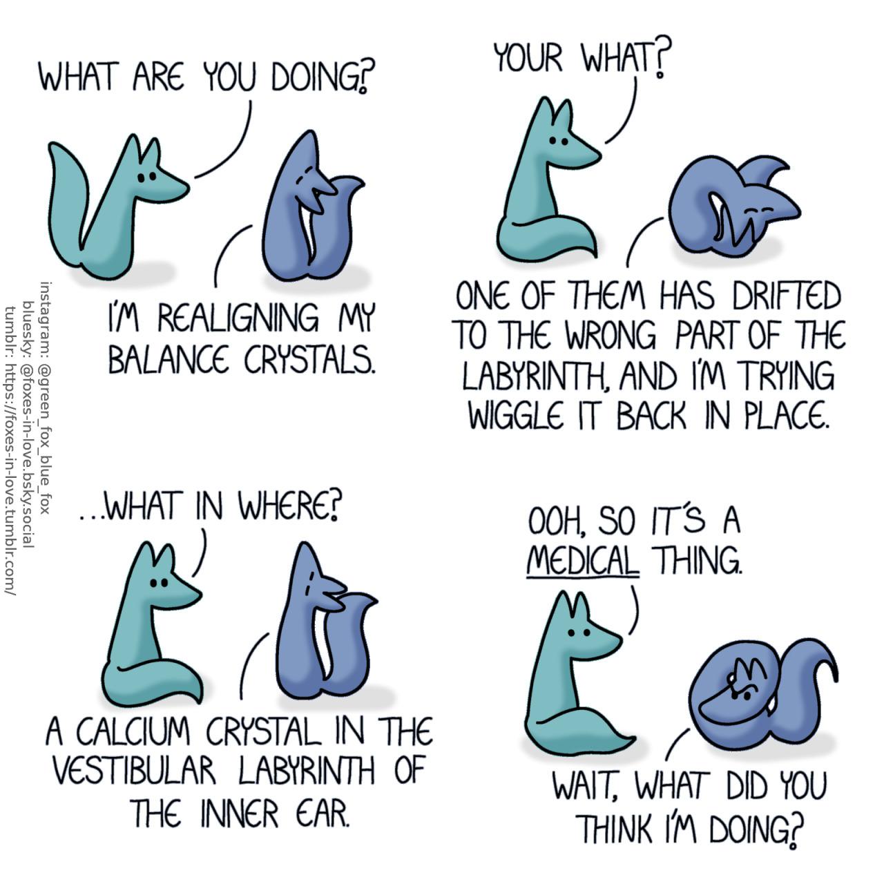 A comic of two foxes, one of whom is blue, the other is green. In this one, Green arrives at the scene as Blue is twisting himself into unusual positions, turning his head up, down, and upside-down. Green: What are you doing? Blue: I'm realigning my balance crystals. Green: Your what? Blue: One of them has drifted to the wrong part of the labyrinth, and I'm trying to wiggle it back in place. Green: ...What in where? Blue: A calcium crystal in the vestibular labyrinth of the inner ear. Green looks awestruck as he finally comprehends what is happening. Twisting himself onto a loop to turn his head towards Green, Blue looks at him with a confused frown. Green: Ooh, so it's a medical thing. Blue: Wait, what did you think I'm doing?