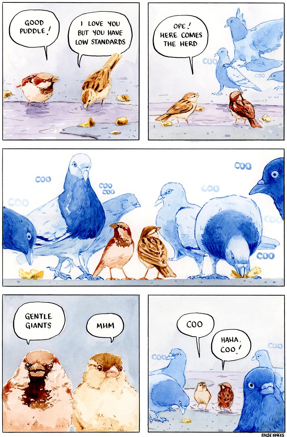 We see two house sparrows drinking out of a puddle. The male says to the female: "Good puddle!" to which she replies "I love you but you have low standards". Pigeons arrive in the background, the female says "Ope! Here comes the herd" There is a long horizontal frame of the two sparrows in the midst of a bunch of pigeons cooing around them. The male then says "gentle giants" the female agrees "mhm" and then says "coo" and the male responds "haha. coo!"