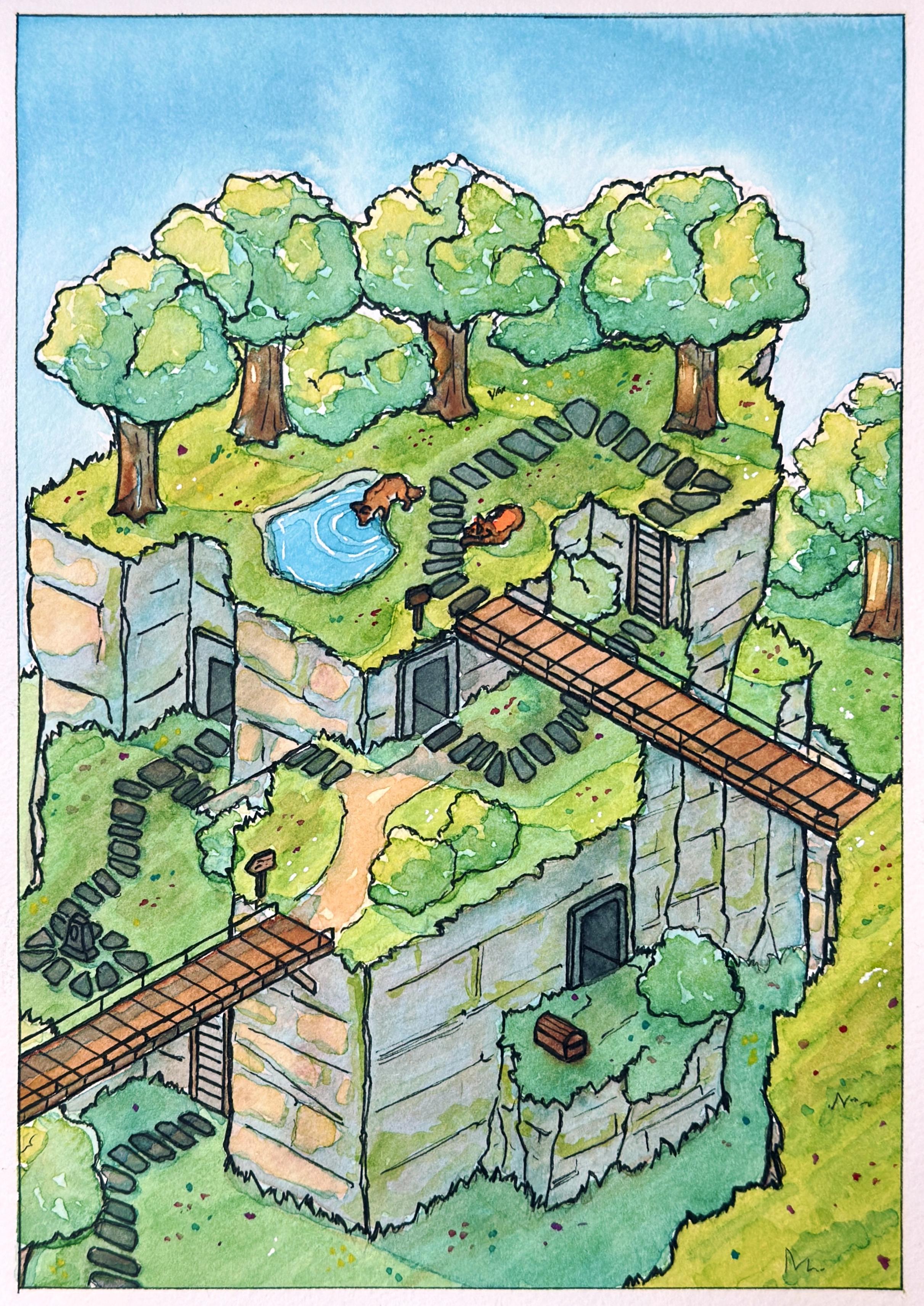 A watercolor painting of some grassy hills in an isometric perspective with a couple of bridges, pathways and doors and two foxes on the top of it, one of them sipping water from a pond while the other one is laying near them.