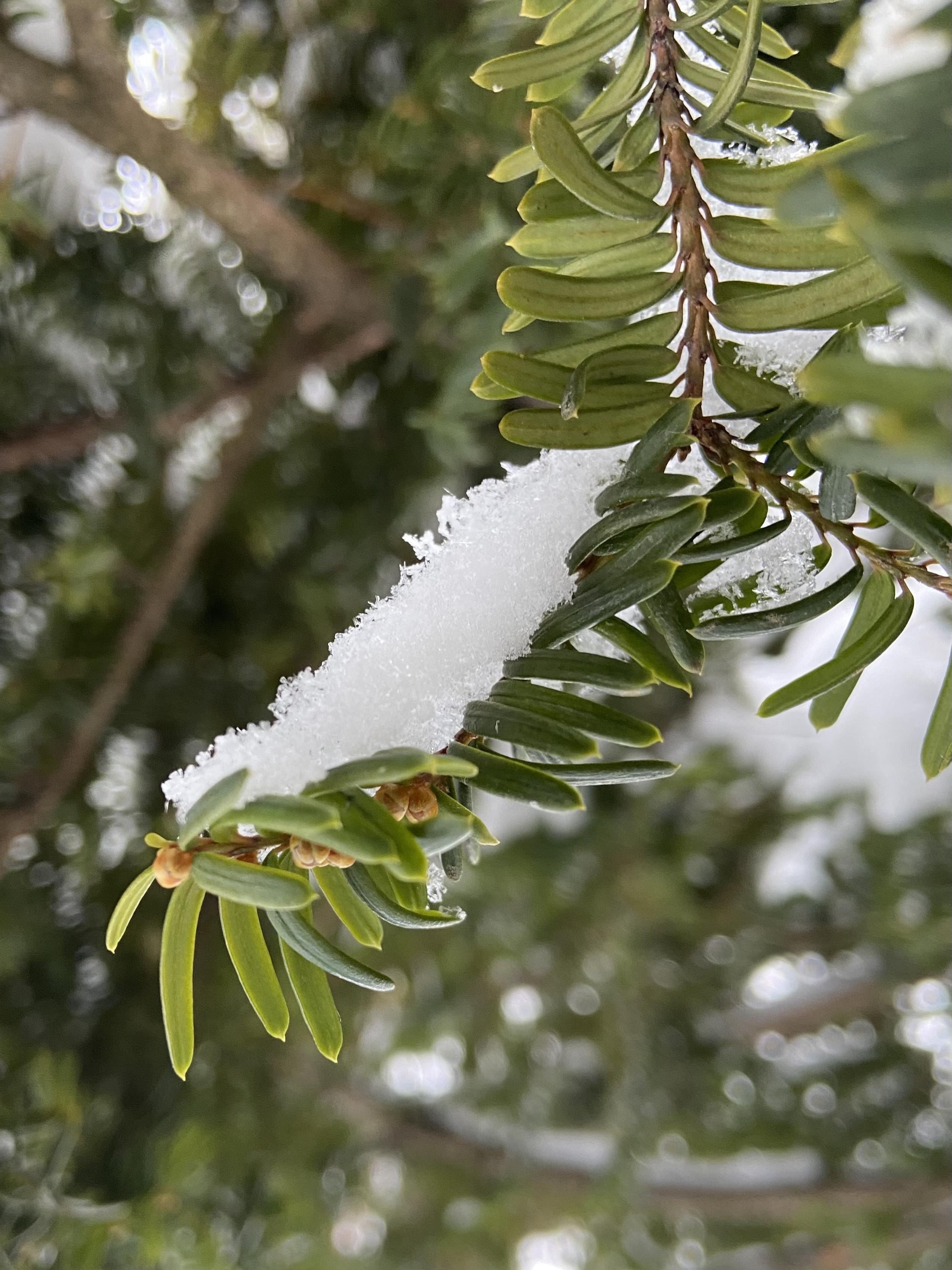 A tip of a yew branch, with its slender green needles and little brown flower buds, holding snow.