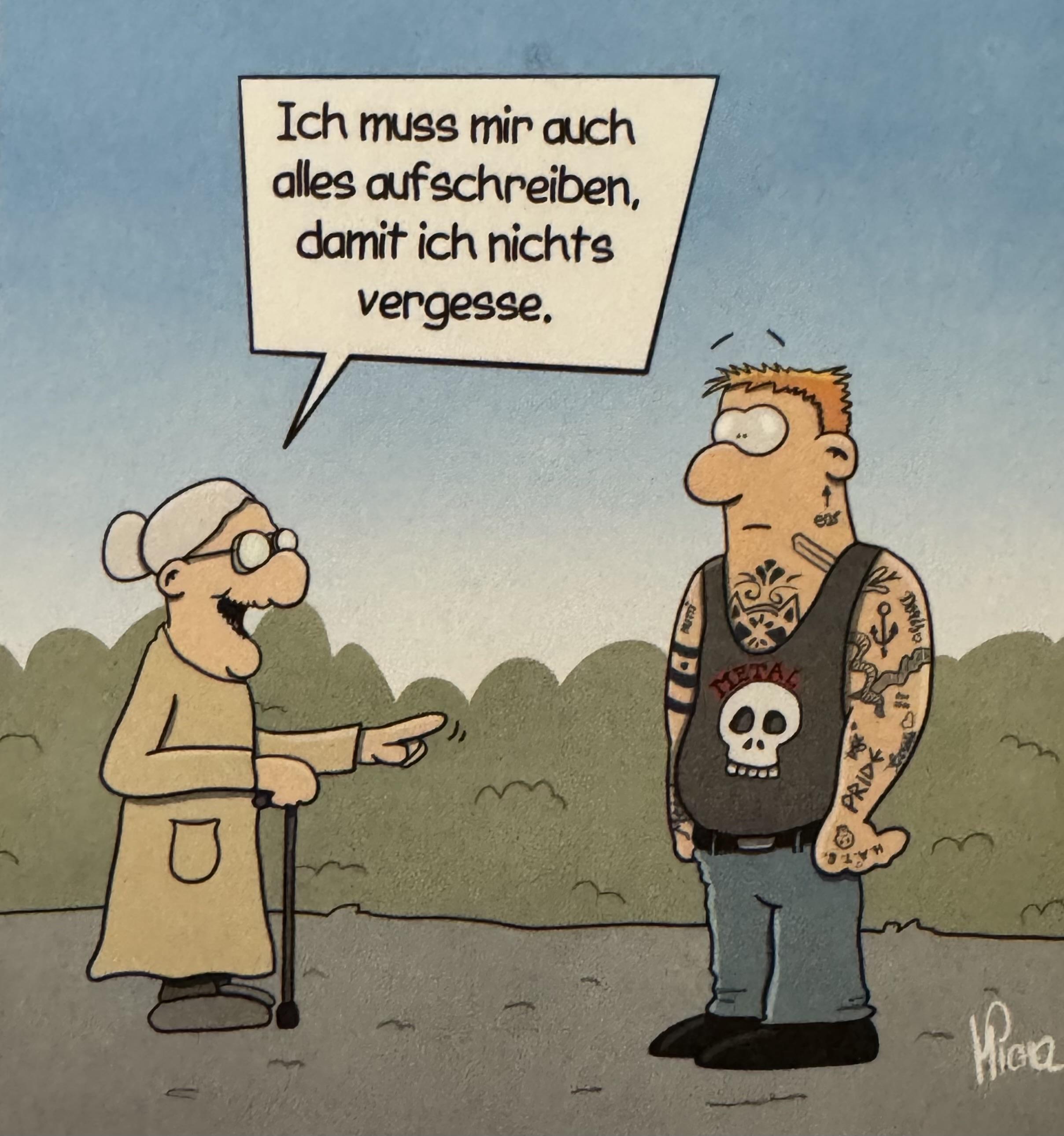 Eine Karikatur zeigt eine ältere Frau mit Brille und Gehstock, die mit einem tätowierten Mann in einem ärmellosen Hemd spricht. Die Frau sagt, dass sie auch alles aufschreiben muss, um nichts zu vergessen. Im Hintergrund ist eine einfache Landschaft zu sehen.