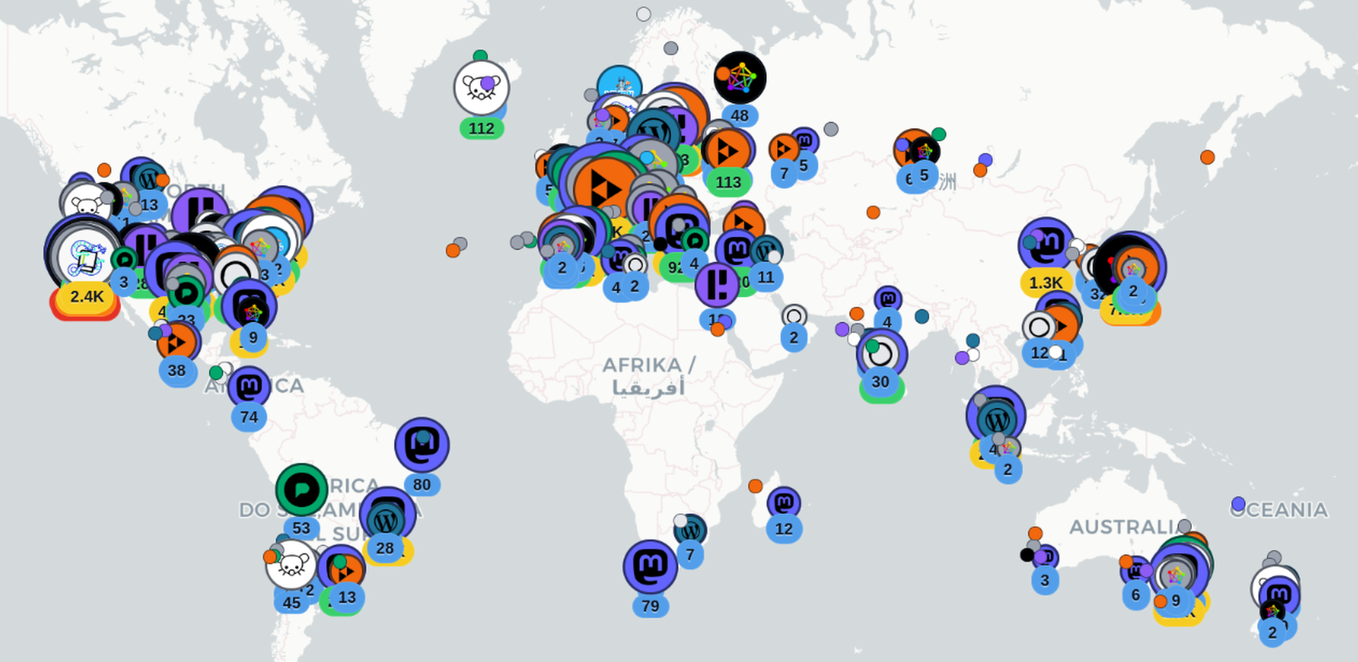 Weltkarte mit Diensten des Fediverse