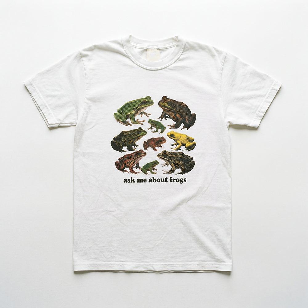 A white tshirt with a bunch of frogs on it. It says ask me about frogs.