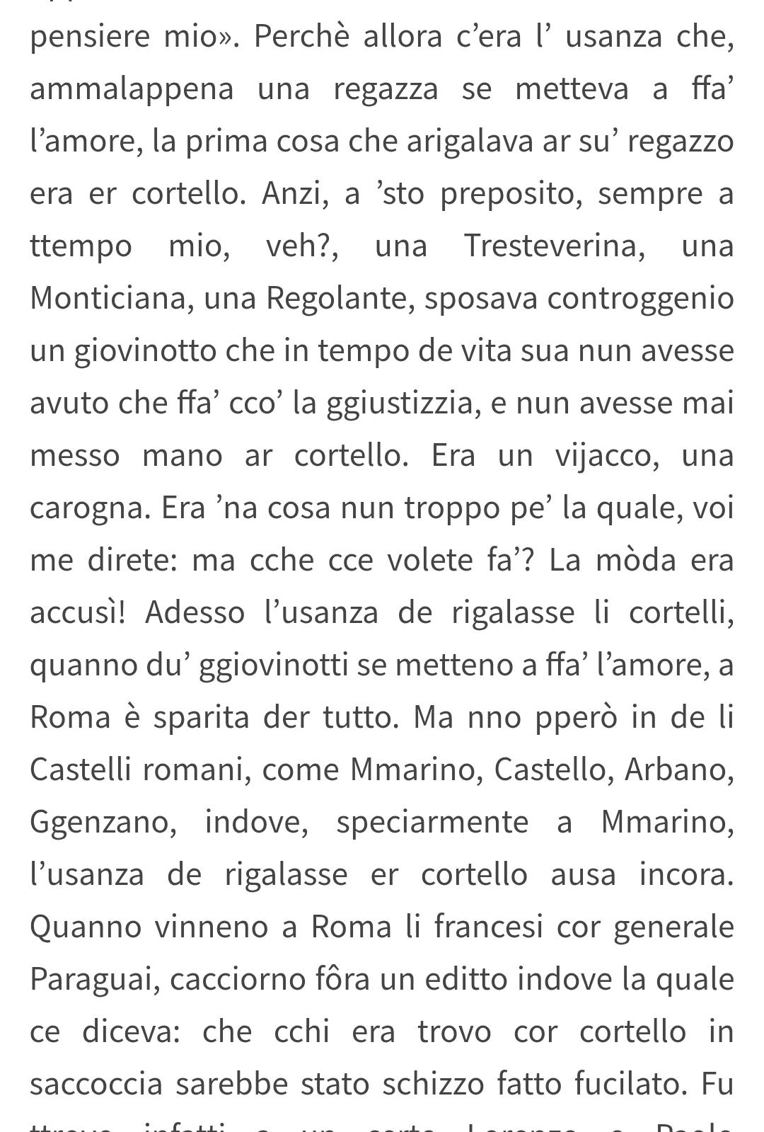 pensiere mio». Perche allora c’era I’ usanza che, ammalappena una regazza se metteva a ffa’ ’amore, la prima cosa che arigalava ar su’ regazzo era er cortello. Anzi, a sto preposito, sempre a ttempo mio, veh?, una Tresteverina, una Monticiana, una Regolante, sposava controggenio un giovinotto che in tempo de vita sua nun avesse avuto che ffa’ cco’ la ggiustizzia, e nun avesse mai messo mano ar cortello. Era un vijacco, una carogna. Era ’na cosa nun troppo pe’ la quale, voi me direte: ma cche cce volete fa’? La moda era accusi! Adesso l'usanza de rigalasse li cortelli, quanno du’ ggiovinotti se metteno a ffa’ "amore, a Roma e sparita der tutto. Ma nno ppero in de li Castelli romani, come Mmarino, Castello, Arbano, Ggenzano, indove, speciarmente a Mmarino, usanza de rigalasse er cortello ausa incora. Quanno vinneno a Roma li francesi cor generale Paraguai, cacciorno fora un editto indove la quale ce diceva: che cchi era trovo cor cortello in saccoccia sarebbe stato schizzo fatto fucilato.