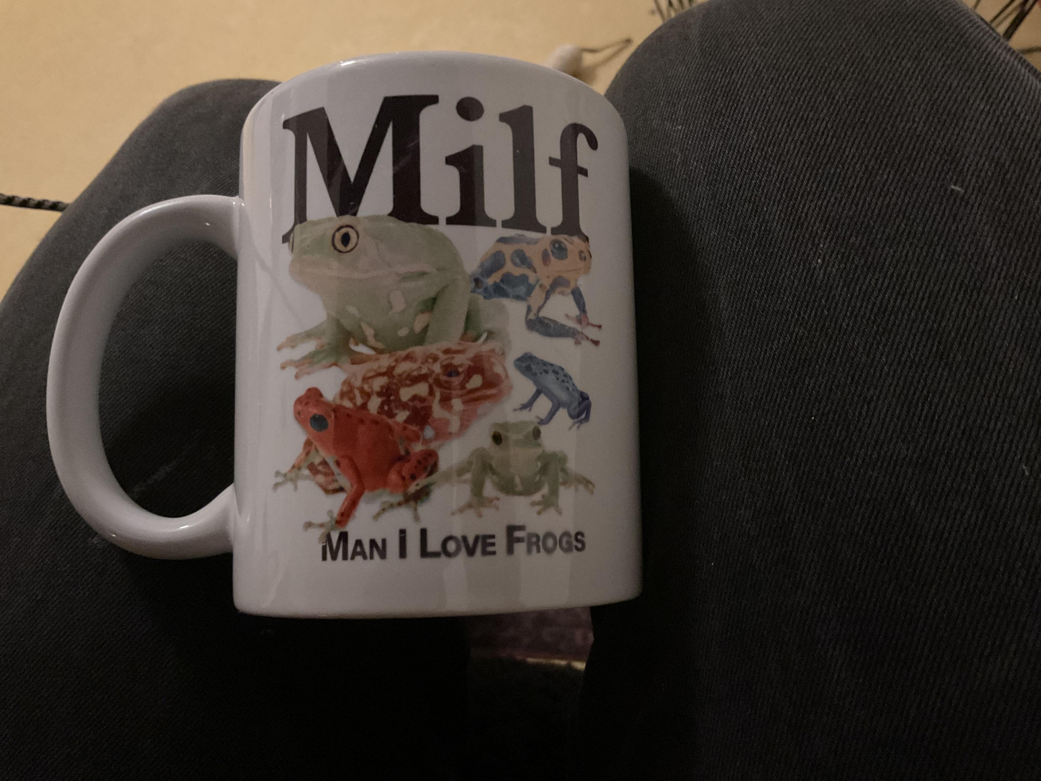 mug saying milf, man I like frogs