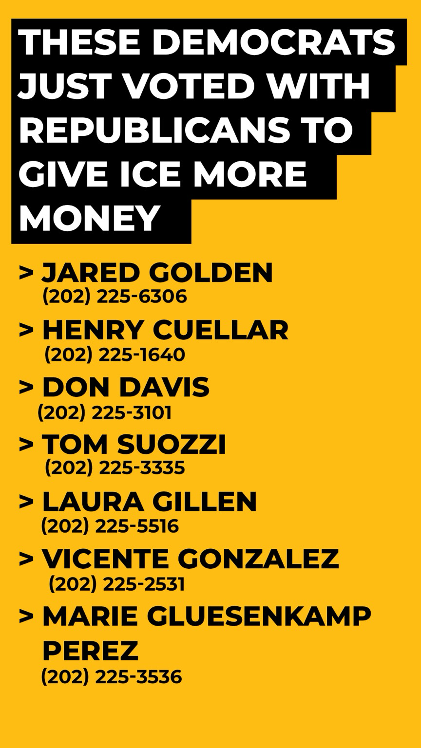 THESE DEMOCRATS JUST VOTED WITH REPUBLICANS TO GIVE ICE MORE MONEY > JARED GOLDEN (202) 225-6306 > HENRY CUELLAR (202) 225-1640 › DON DAVIS (202) 225-3101 > TOM SUOZZI (202) 225-3335 > LAURA GILLEN (202) 225-5516 > VICENTE GONZALEZ (202) 225-2531 > MARIE GLUESENKAMP PEREZ (202) 225-3536