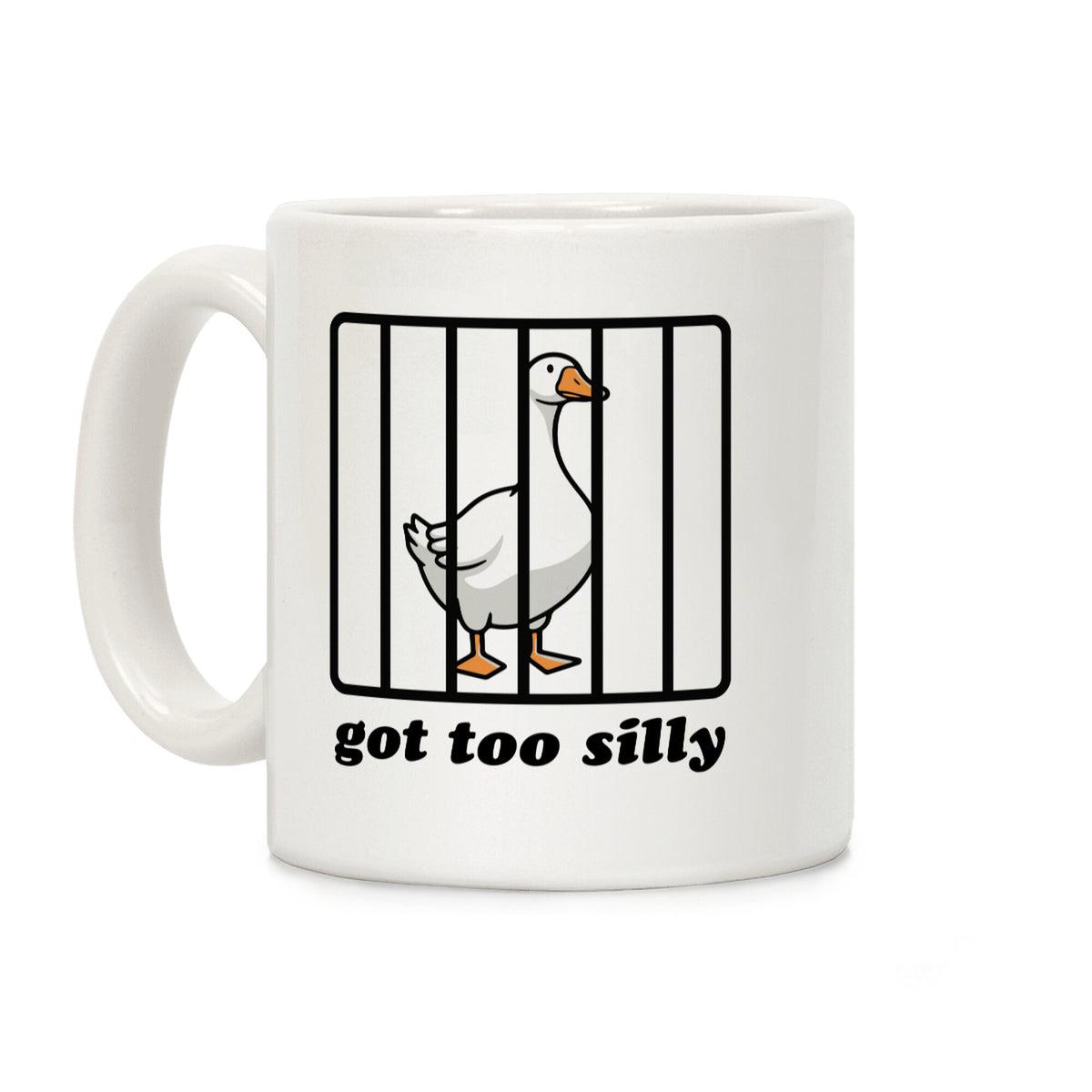 A white mug with a goose behind bars. It says "got too silly".