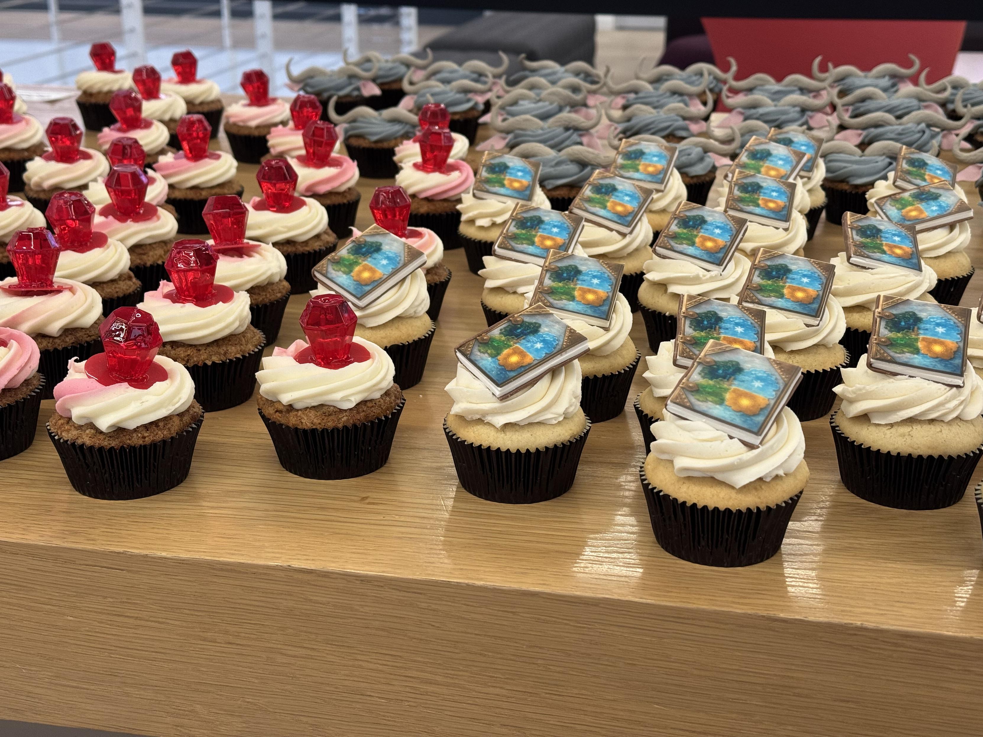 Closer view of the pacifier, Lynxley journal, and Bogo-shaped cupcakes.