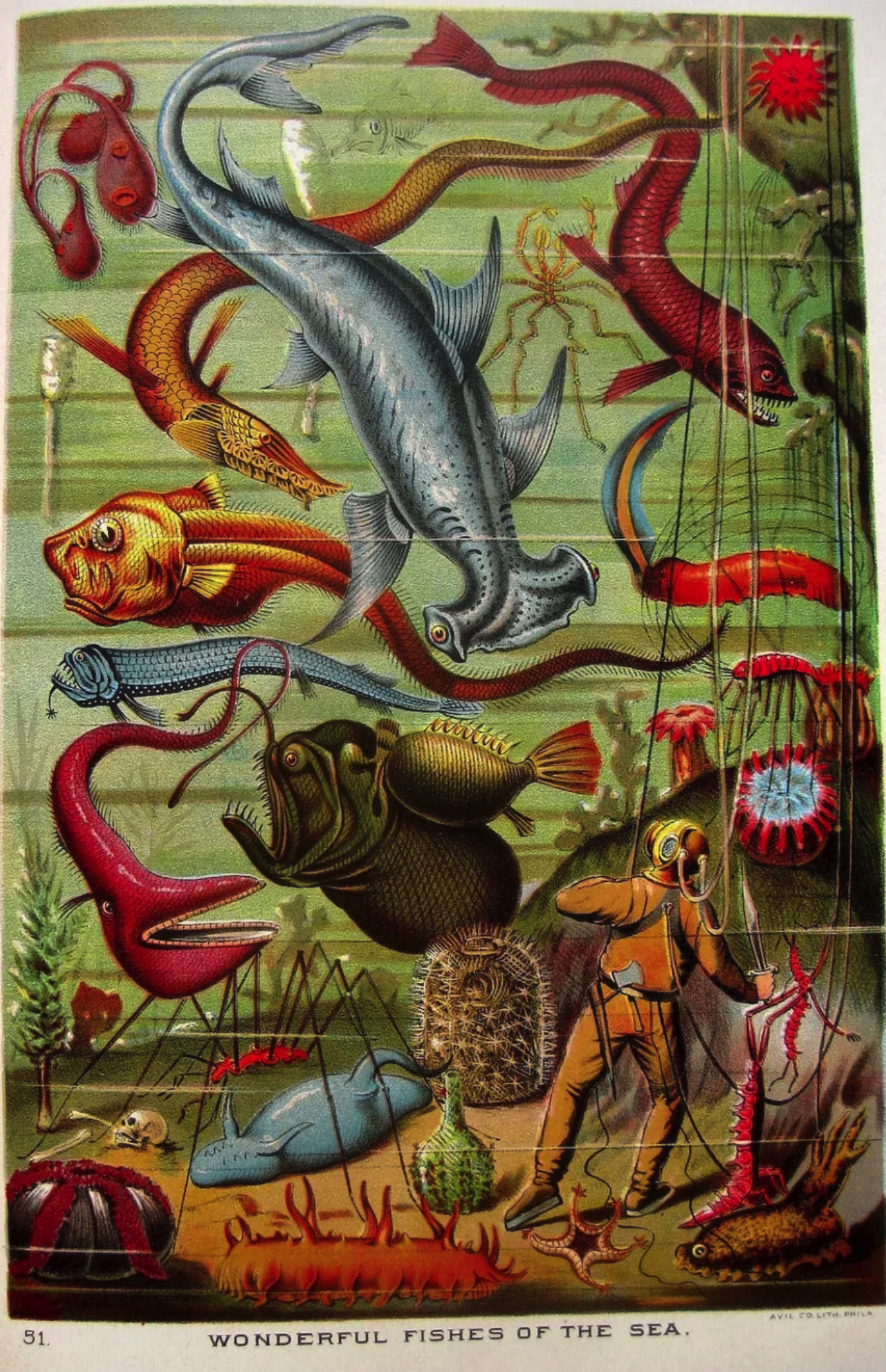 A colorful, cluttered Victorian illustration of "wonderful fishes of the sea" there are angler fish, eels, sharks, and a diver in an old style suit. Many of the creatures are bizarre and unreal looking.