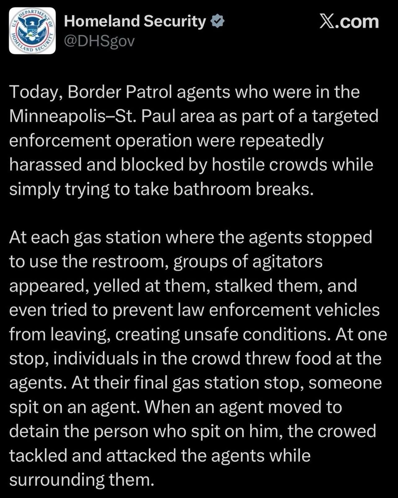 A screenshot reading: Homeland Security X.com @DHSgov Today, Border Patrol agents who were in the Minneapolis-St. Paul area as part of a targeted enforcement operation were repeatedly harassed and blocked by hostile crowds while simply trying to take bathroom breaks. At each gas station where the agents stopped to use the restroom, groups of agitators appeared, yelled at them, stalked them, and even tried to prevent law enforcement vehicles from leaving, creating unsafe conditions. At one stop, individuals in the crowd threw food at the agents. At their final gas station stop, someone spit on an agent. When an agent moved to detain the person who spit on him, the crowed tackled and attacked the agents while surrounding them.