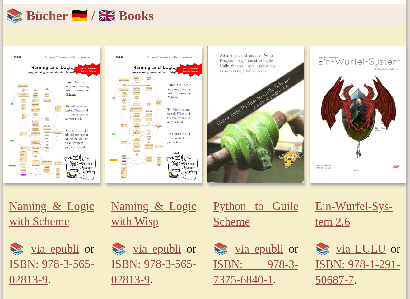 Four books shown in a line. Beneath each of the books is its title: - Naming & Logic with Scheme - Naming & Logic with Wisp - Python to Guile Scheme - Ein-WΓΌrfel-System 2.6 Below each title is a symbol of a stack of books next to a buy-link and the ISBN.