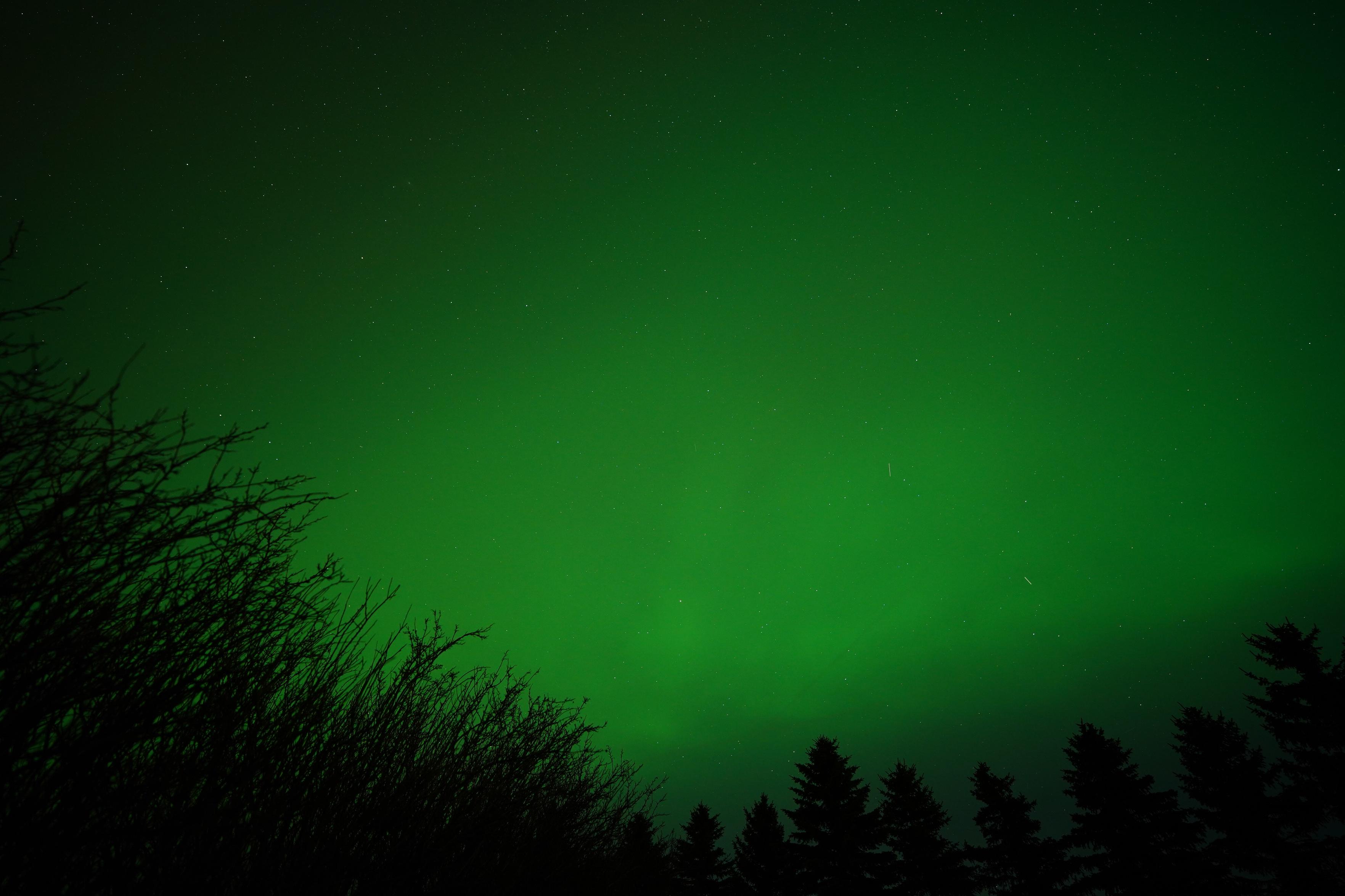 A bunch of spruce trees silhouetted in front of bright green sky.