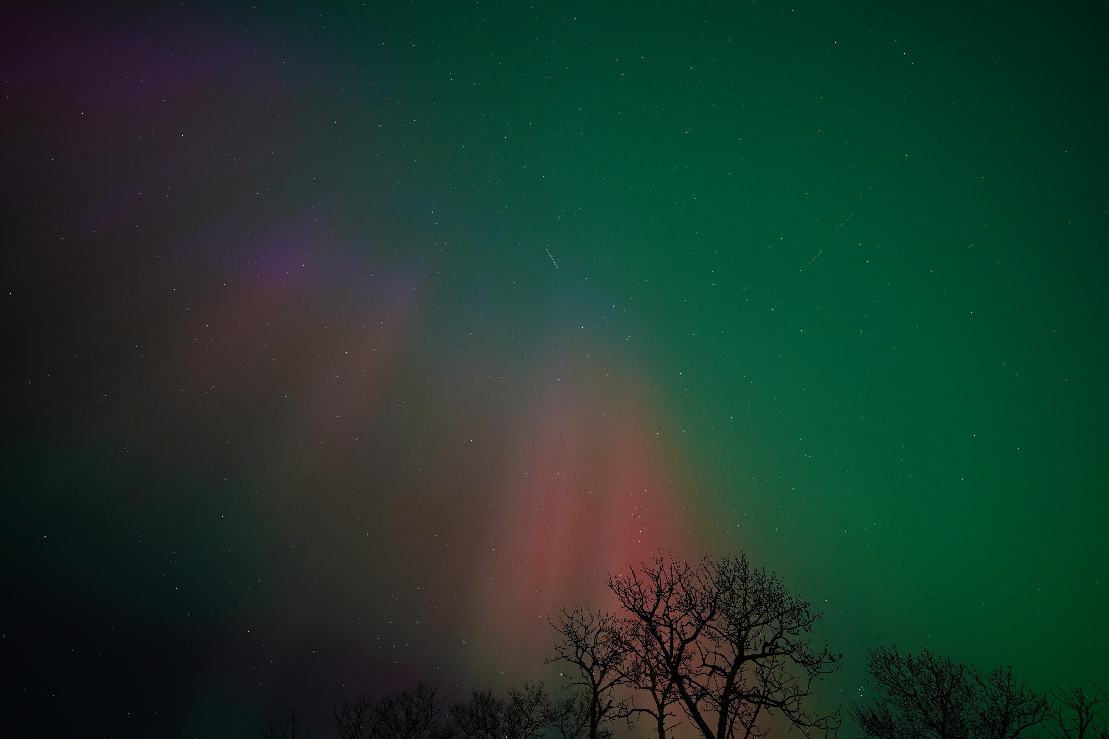 A silhouetted bare tree, with red columns behind it, and green covering the whole rest of the sky.