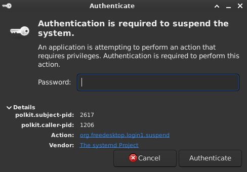 dialog box asking for a password because "Authentication is required to suspend the system"
