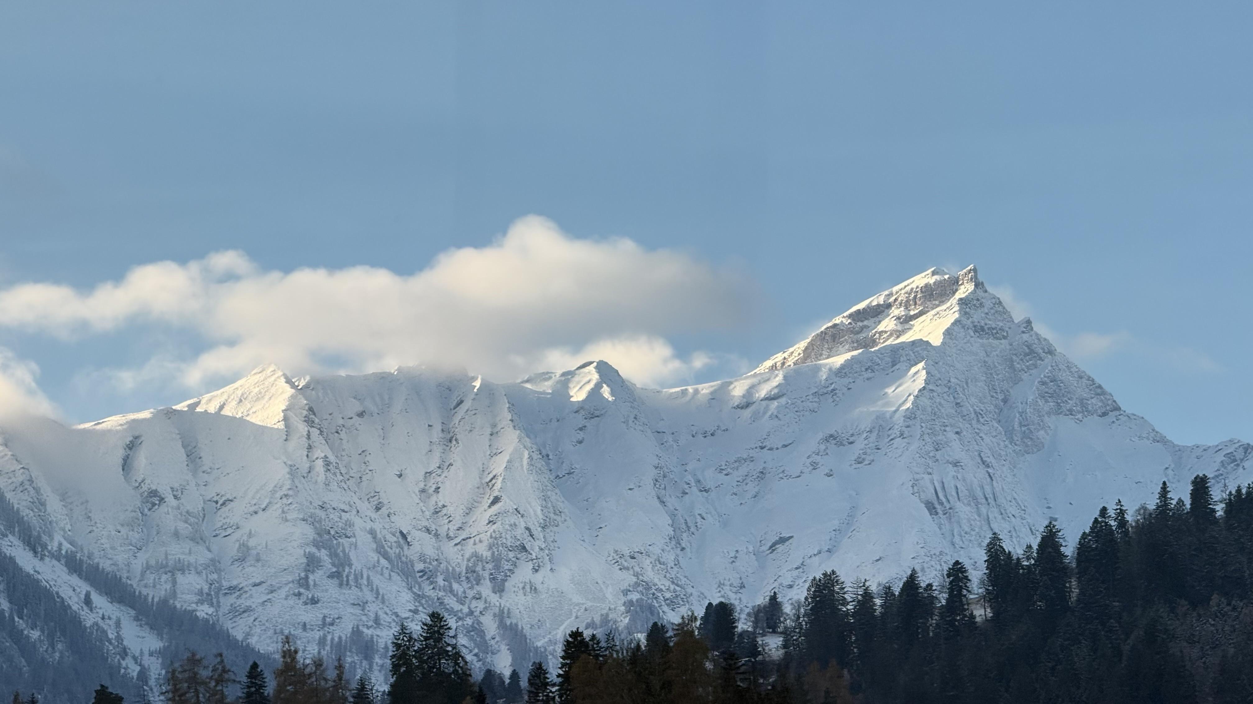 A snowy mountain range under a clear blue sky, with some clouds drifting near the peaks. Trees are visible in the foreground.