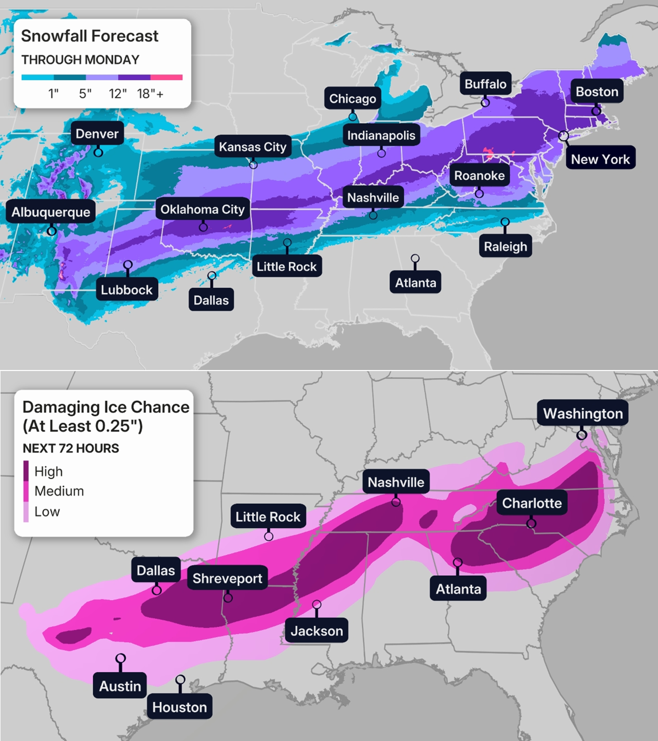 Map from the Weather channel of snowfall and ice accumulation amounts.