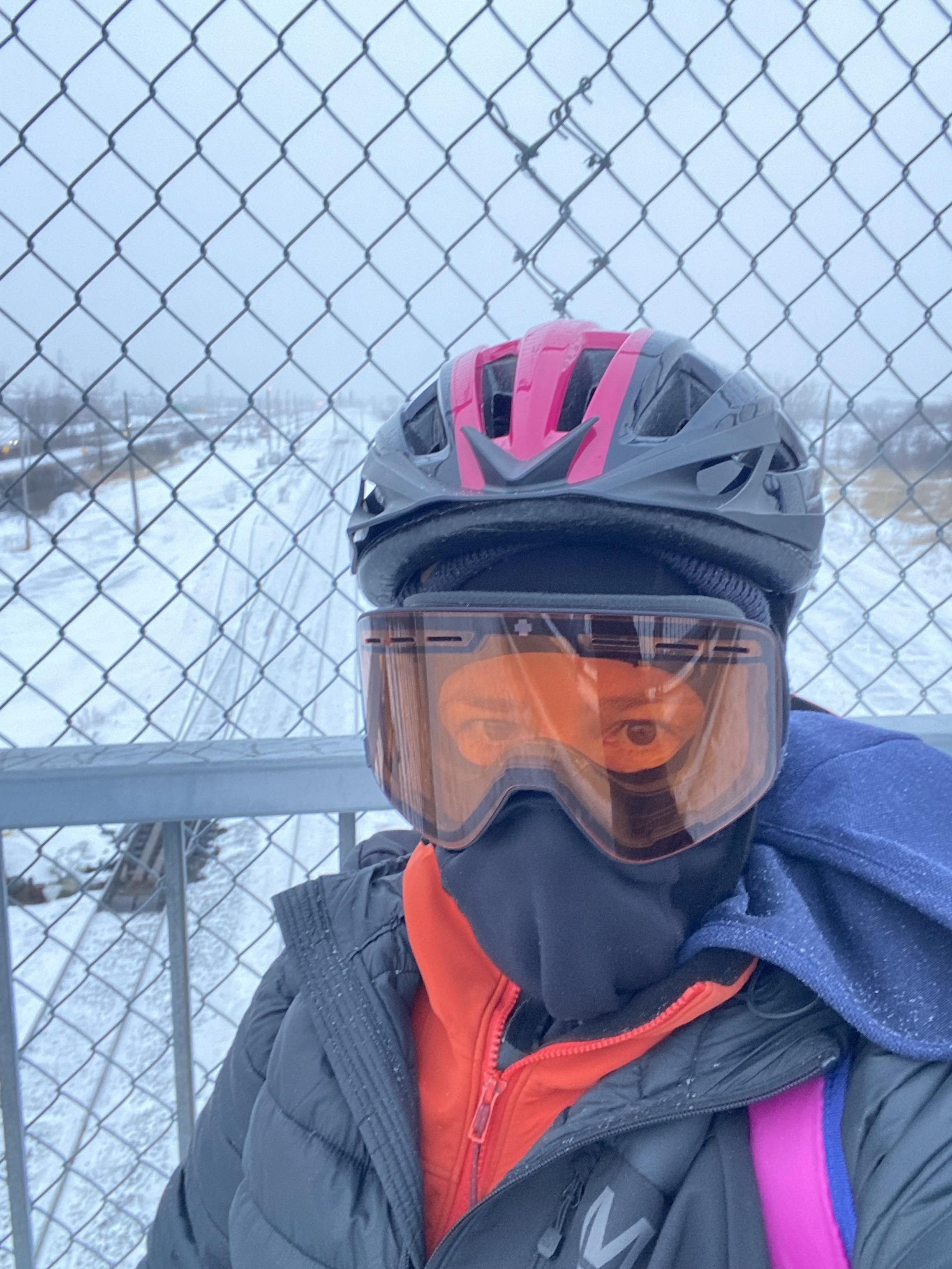 Selfie of a person wearing bike helmet, ski goggles, balaclava, and layered jackets. In front of a chain link fence overlooking train tracks below. It's snowy and gray.
