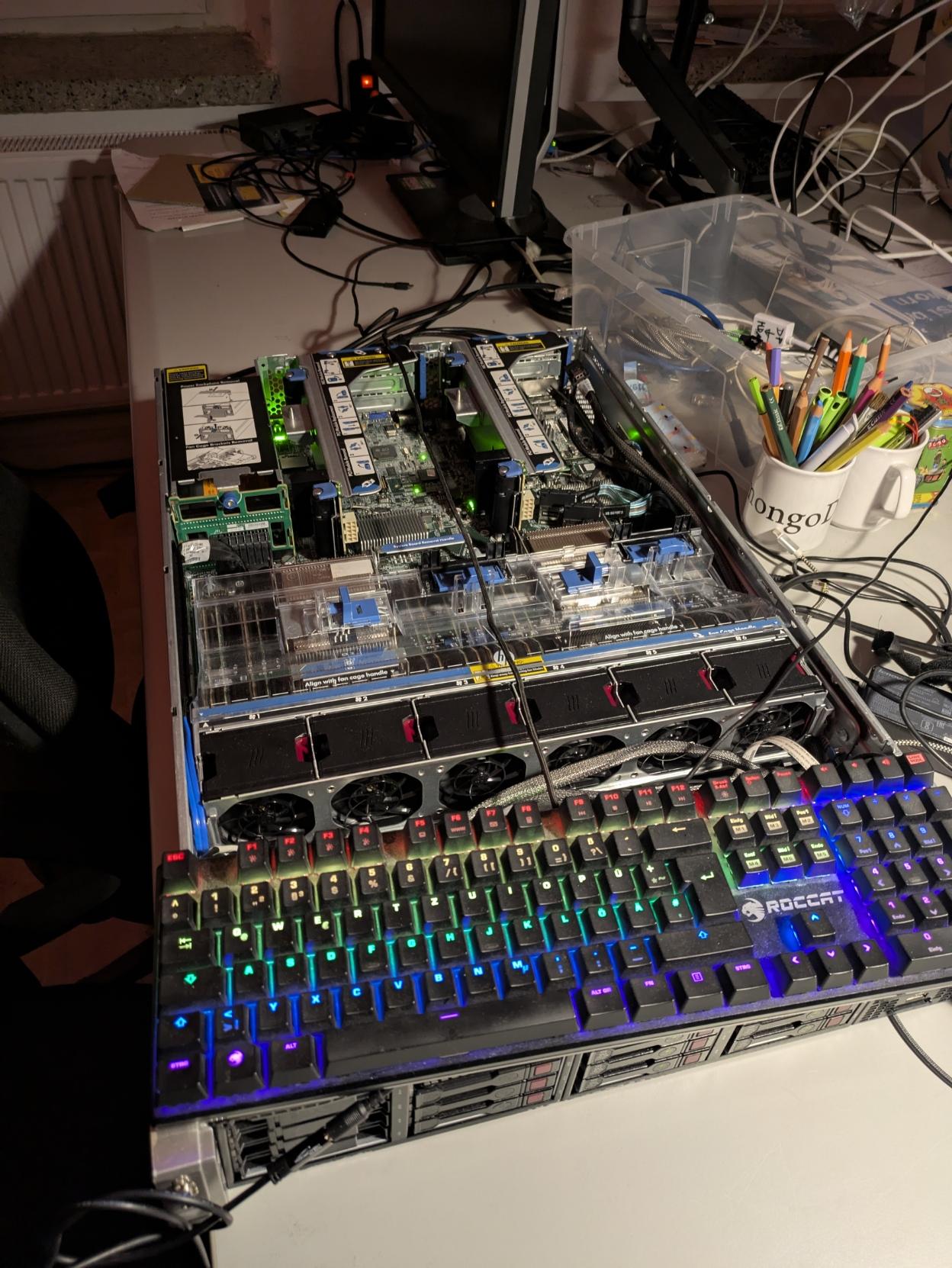 a HP Proliant DL380p without cover, with an RGB gaming keyboard by roccat plugged in