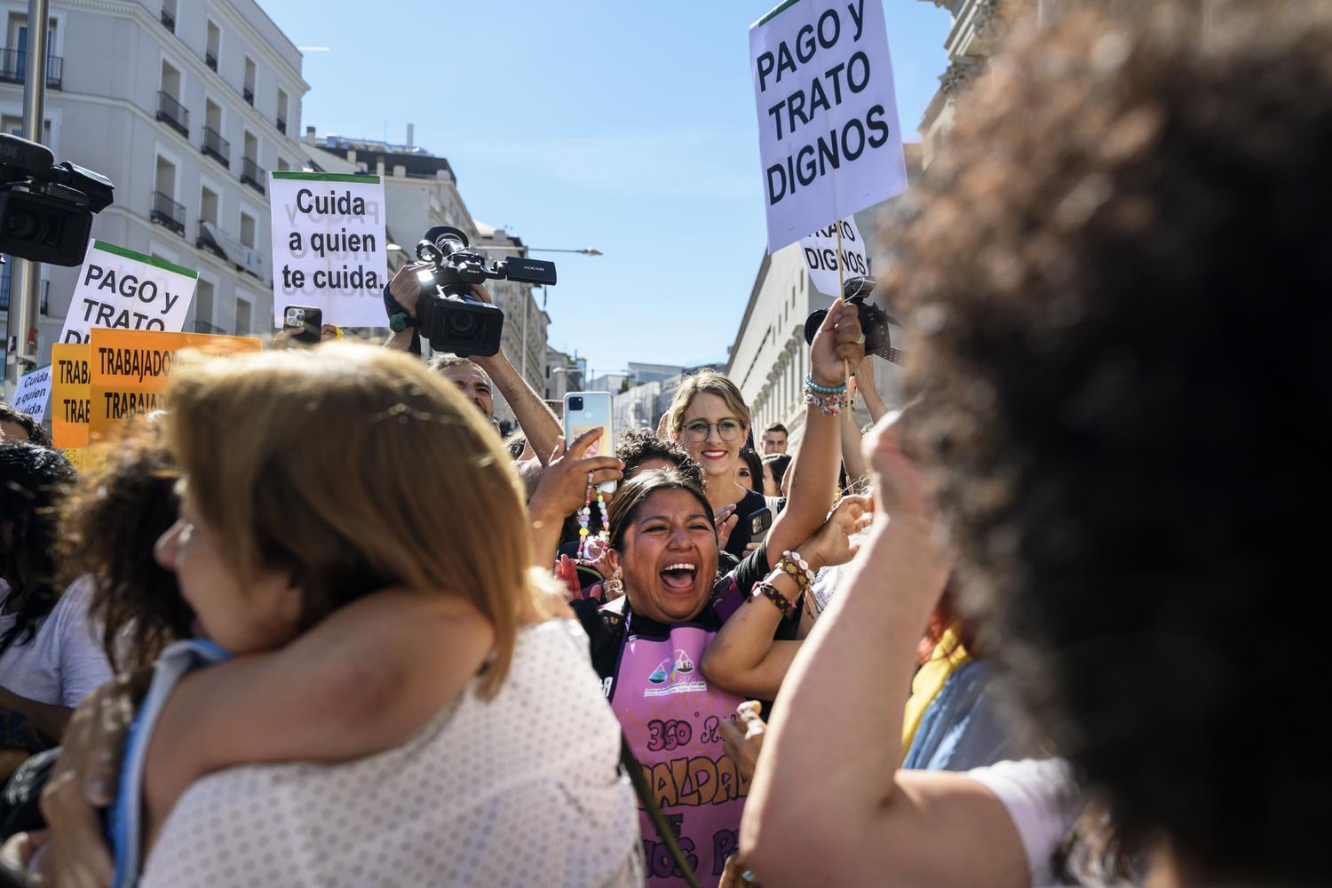 Pancarta que dice "cuida a quien te cuida", en un amanifestaciΓ³n de empleadas de hogar en Madrid.