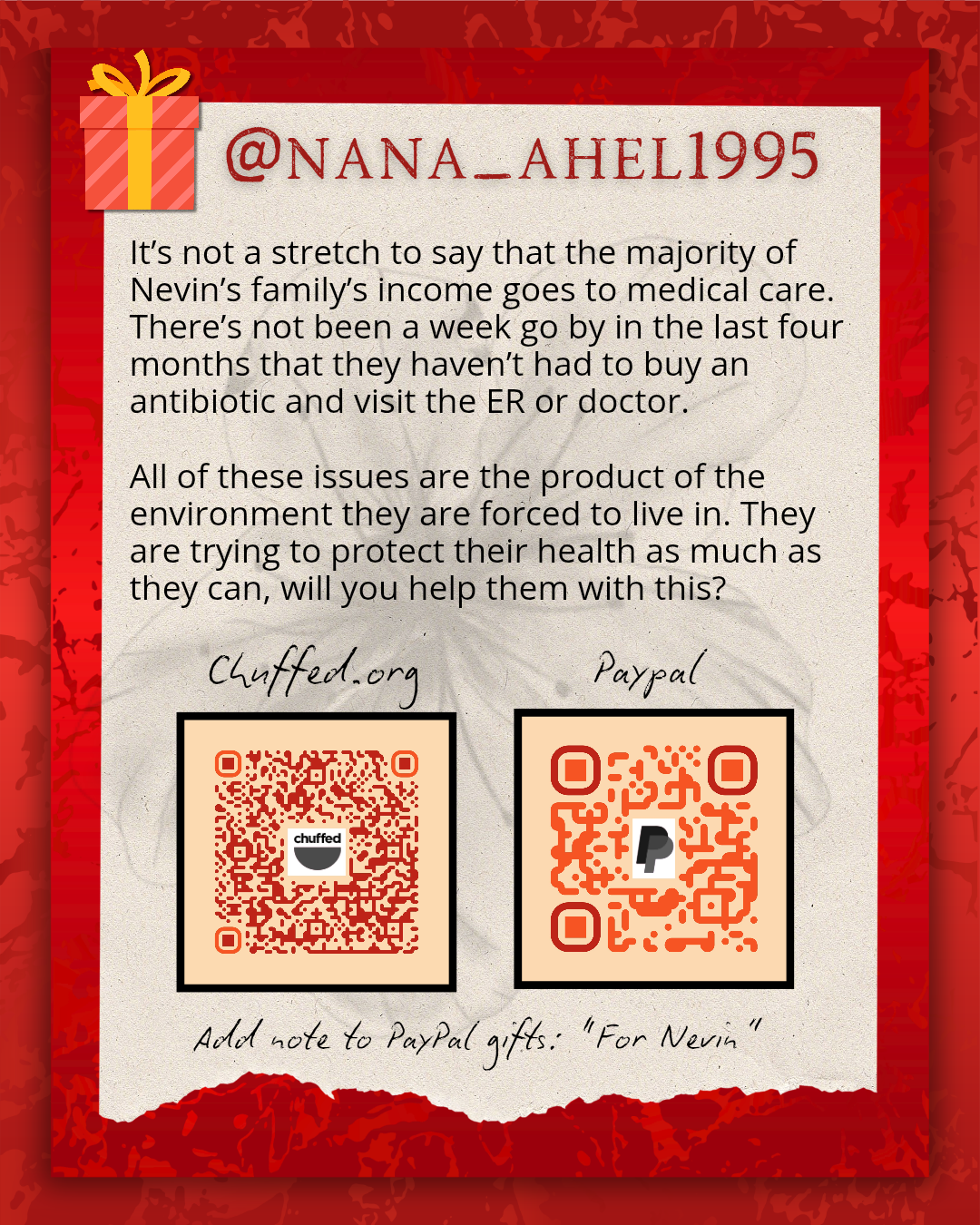 A promotional flyer with a red background with a scrap ofpaper lain on it. The paper has a faint sketch of a flower in the background, text and two QR codes, one for A chuffed.org campaign and one for a paypal account. There is script below that says adda note to PayPal gifts "For Nevin". The text above the QR codes reads @nana_ahel1995 followed by: It's not a stretch to say that the majority of Nevin's family income goes to medical care. There's not been a week go by in the last 4 months that they haven't had to buy an antiobiotic and visit the ER or doctor. All of these issues are the product of the environment they are gorced to live in. They are trying to protect their health as much as they can, will you help them with this?