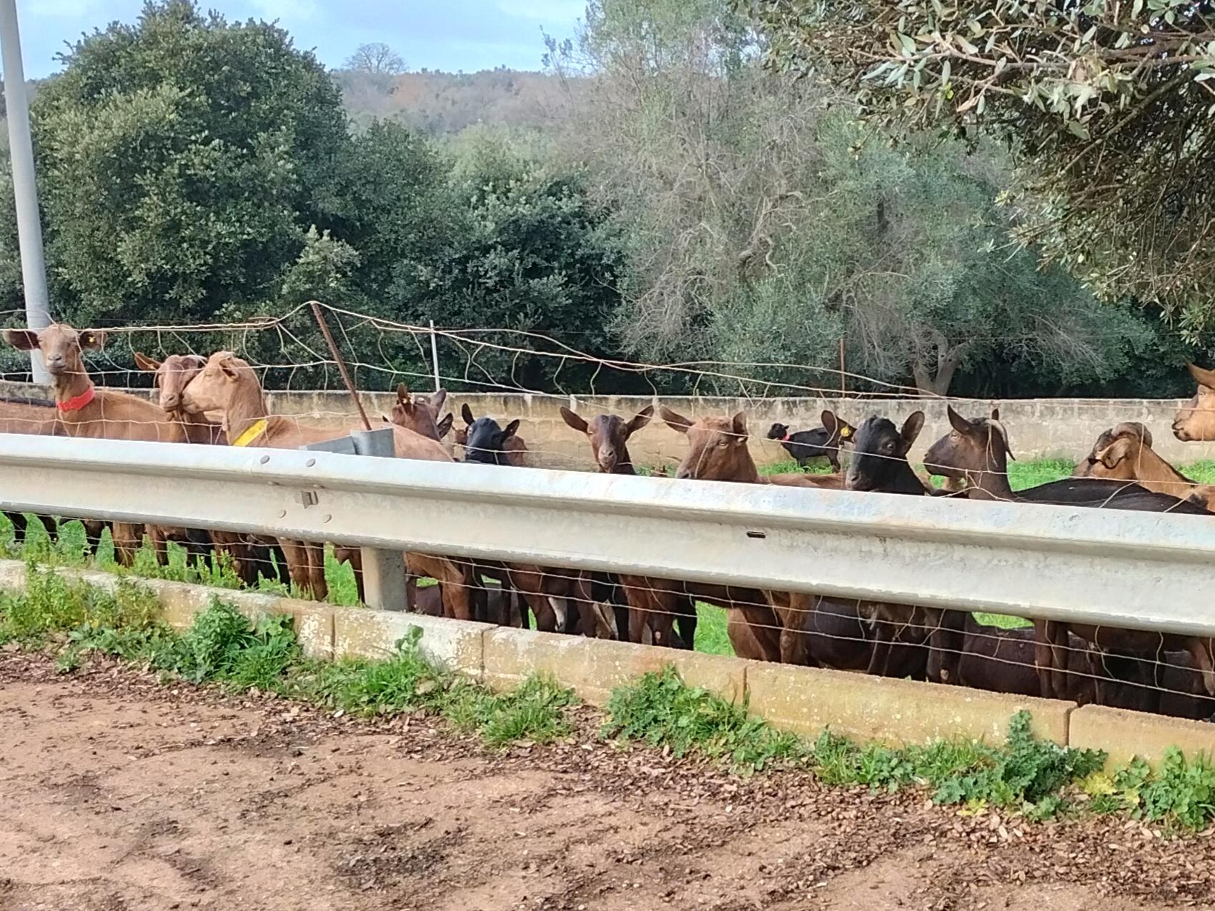 Alcune capre, una di fianco all'altra, al di lĂ di un guard rail di una strada sopraelevata. Sullo sfondo alberi di ulivo ed uno scorcio di cielo azzurro.