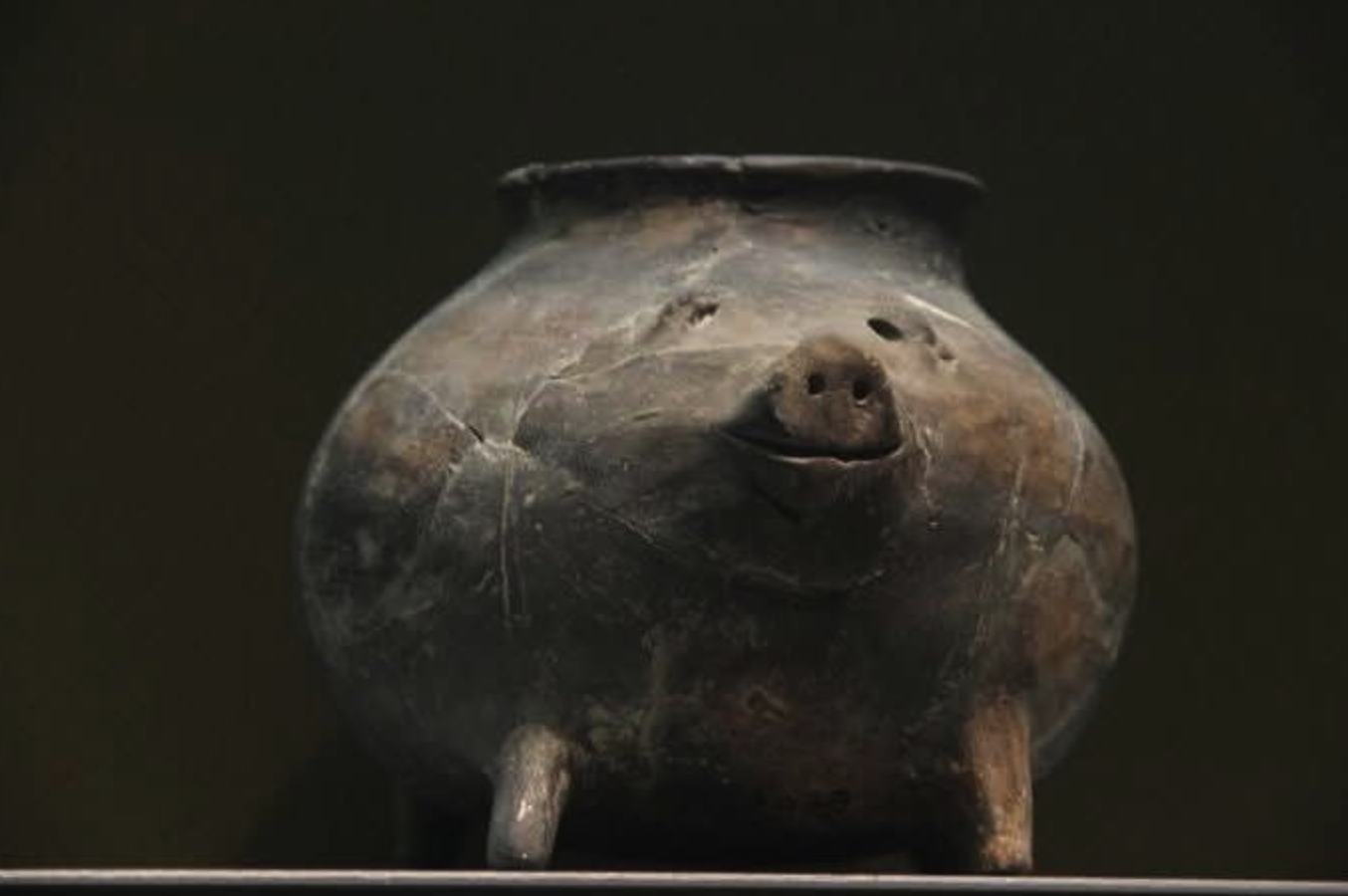 6,000 year old pig-shaped pot. It's a dark pot with a happy pig snout and face and four stubby legs.