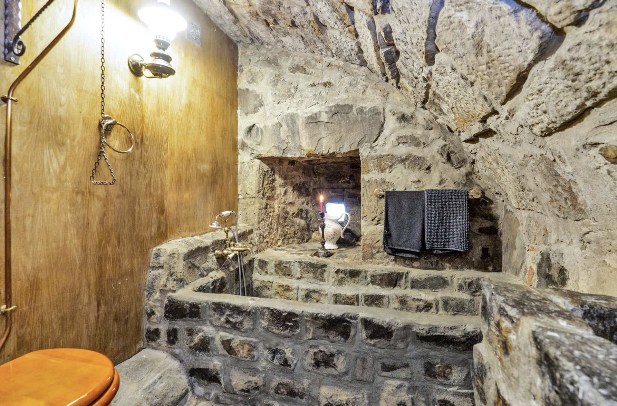 A bath made of stone blocks in a room with a curved stone ceiling and the back wall is made of wood. The bath does not look comfortable.