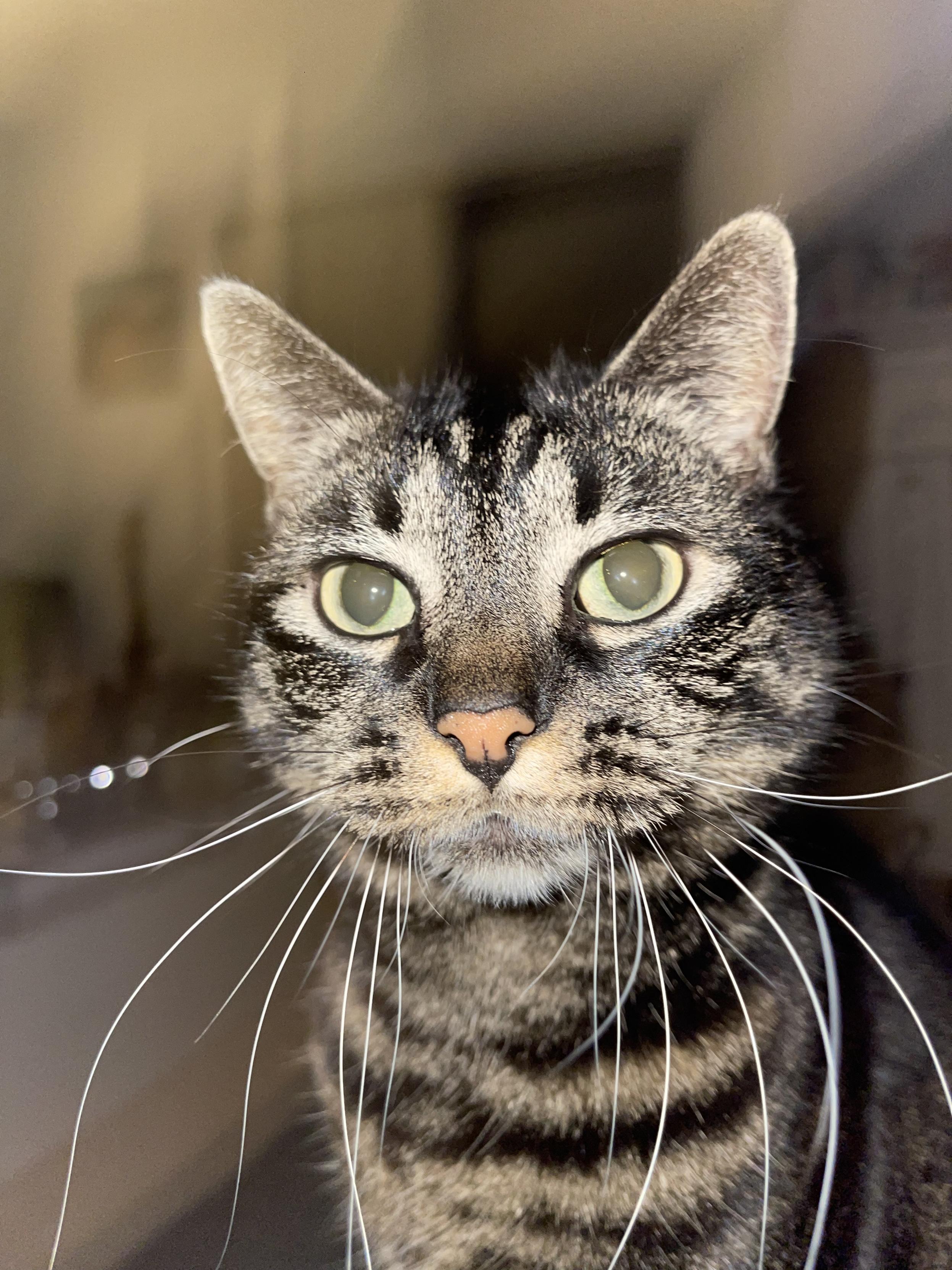 Green eyed, ginger, silver, black tabby cat with walrus white whiskers, looking straight at phone. Photo over exposed with flash.