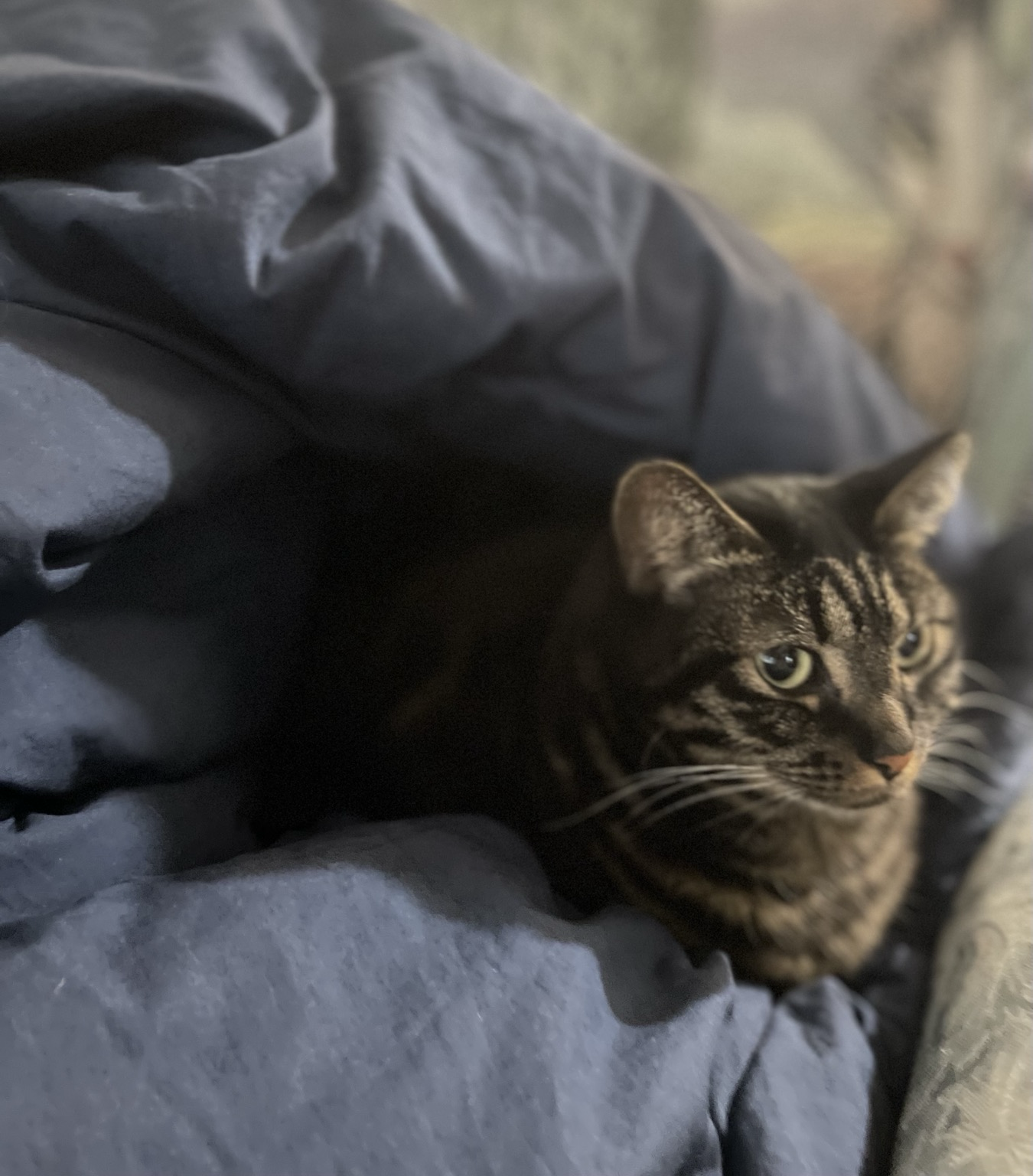 Ginger, silver black tabby in focus, looking off into the distance. As βnothing going on hereβ. Enveloped in a blue quilt.