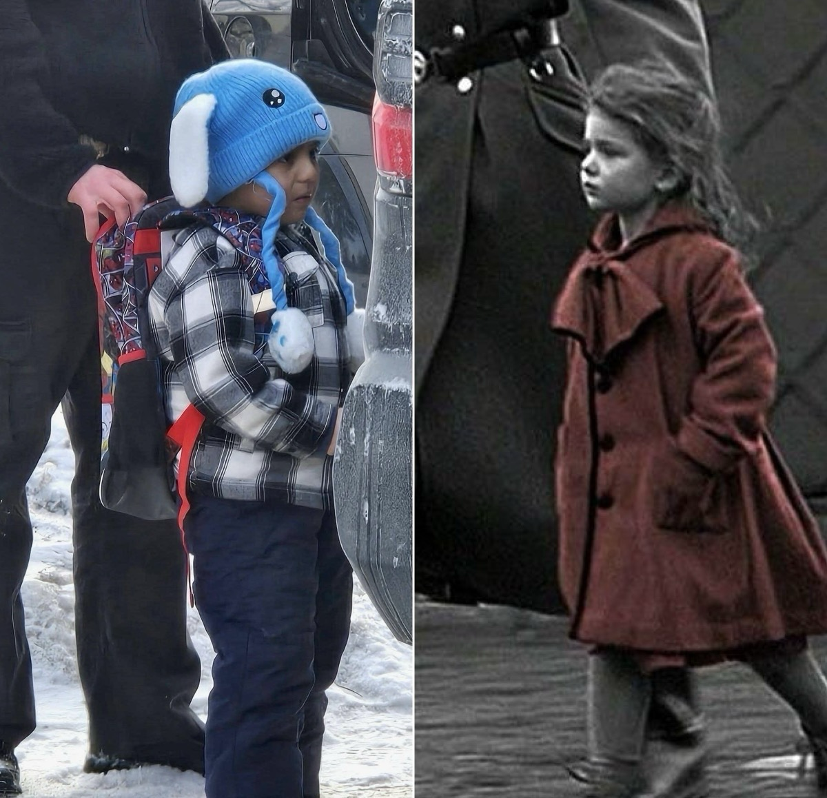 Two images side by side. On the left is a young boy wearing a blue winter cap being held by American ICE. He has been kidnapped to a detention facility. The color is naturally washed out revealing a stark blue. On the right is the girl in the red coat from Schindler's list. She is being kidnapped by a Nazi agent. The film is in black and white except for her stark red coat.
