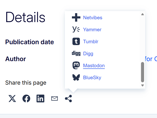 A screenshot from the website of the European Commission. The text "share this page" is followed by icons of popular platforms, such as X, Facebook, Instagram, Email, Netvibes, Yammer, Tumblr, Digg, Mastodon, BlueSky