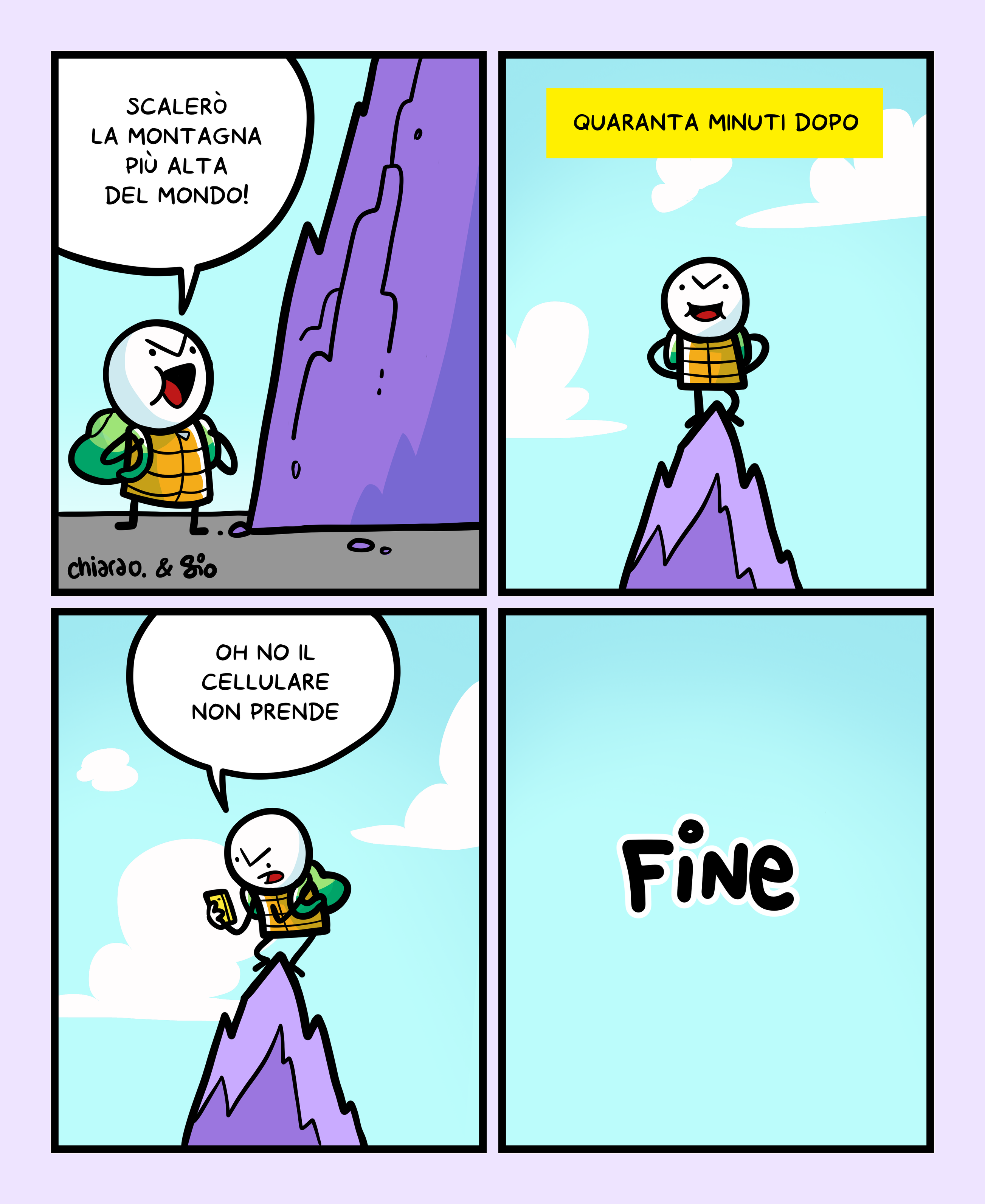 1 Un tizio sta per scalare una montagna e ne va orgoglioso. Dice: "ScalerΓ² la montagna piΓΉ alta del mondo!" 2 Titolo vignetta: Quaranta minuti dopo. Il tizio Γ¨ in cima alla montagna. 3 Il tizio prende il telefono e dice: "Oh no il cellulare non prende." 4 FINE