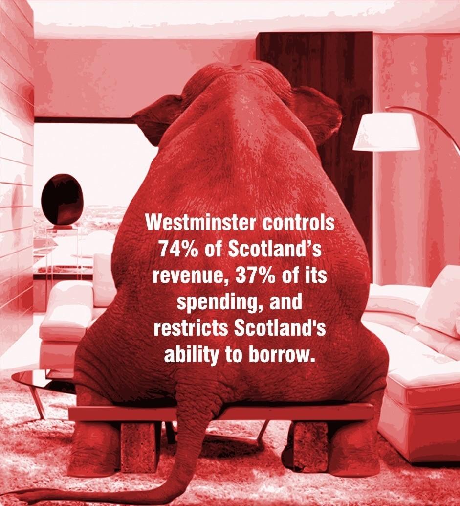 A large elephant sits on a stool in a living room. It has its back to the camera. The caption reads Westminster controls 74% of Scotland's revenue, 37% of its spending, and restricts Scotland's ability to borrow.