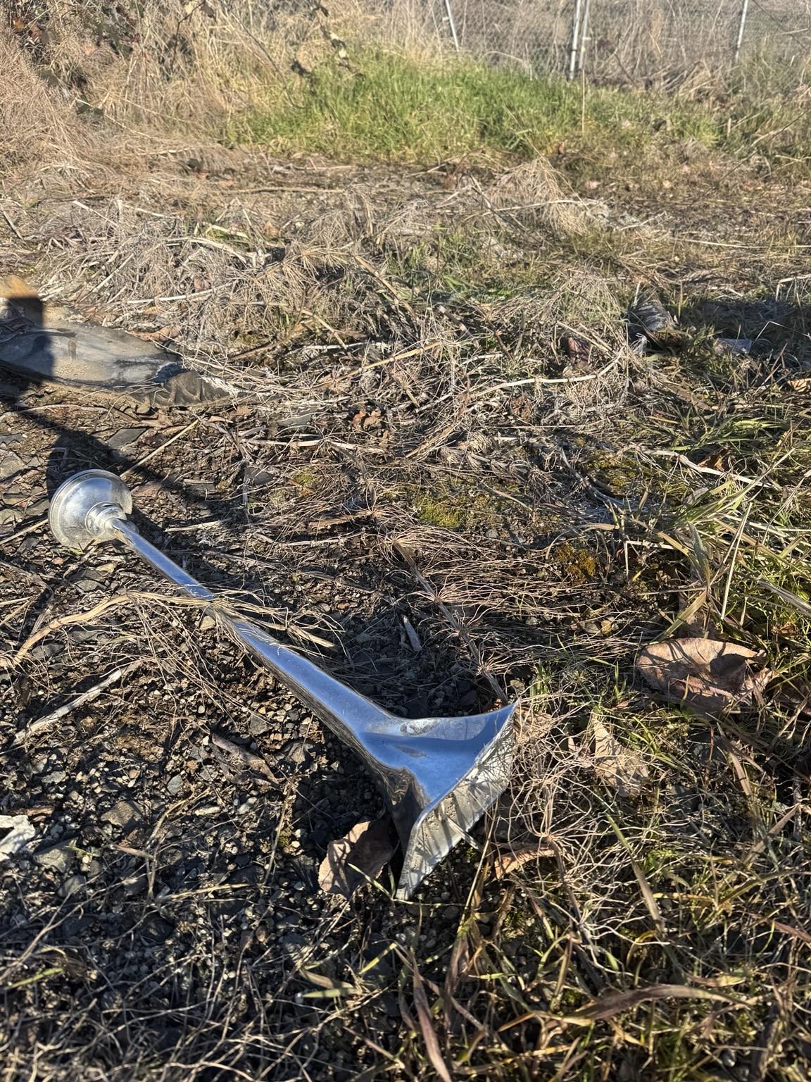 A shiny, metal truck horn is lying on the ground amidst dry grass and twigs.