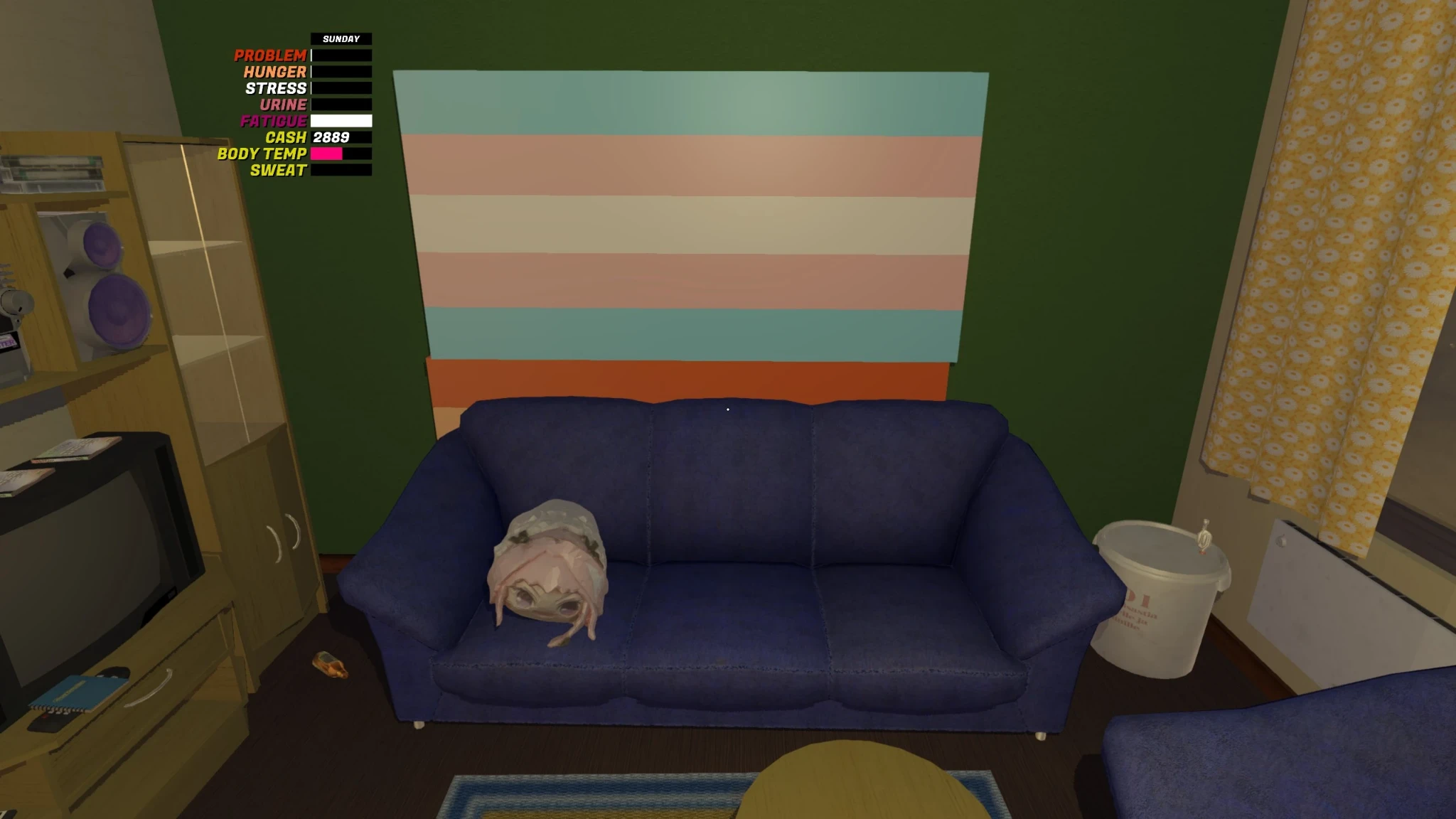 Screenshot of My Winter Car inside the player's apartment. There's a couch with an Astolfo bean plushie on it. Behind the couch are two pride flags stacked on top of each other. The bottom one is lesbian, the top one is transgender. On the left is a TV set and a radio set. On the right is a bucket, heater, and another couch. The player stats displayed on the left top are lesbian themed.