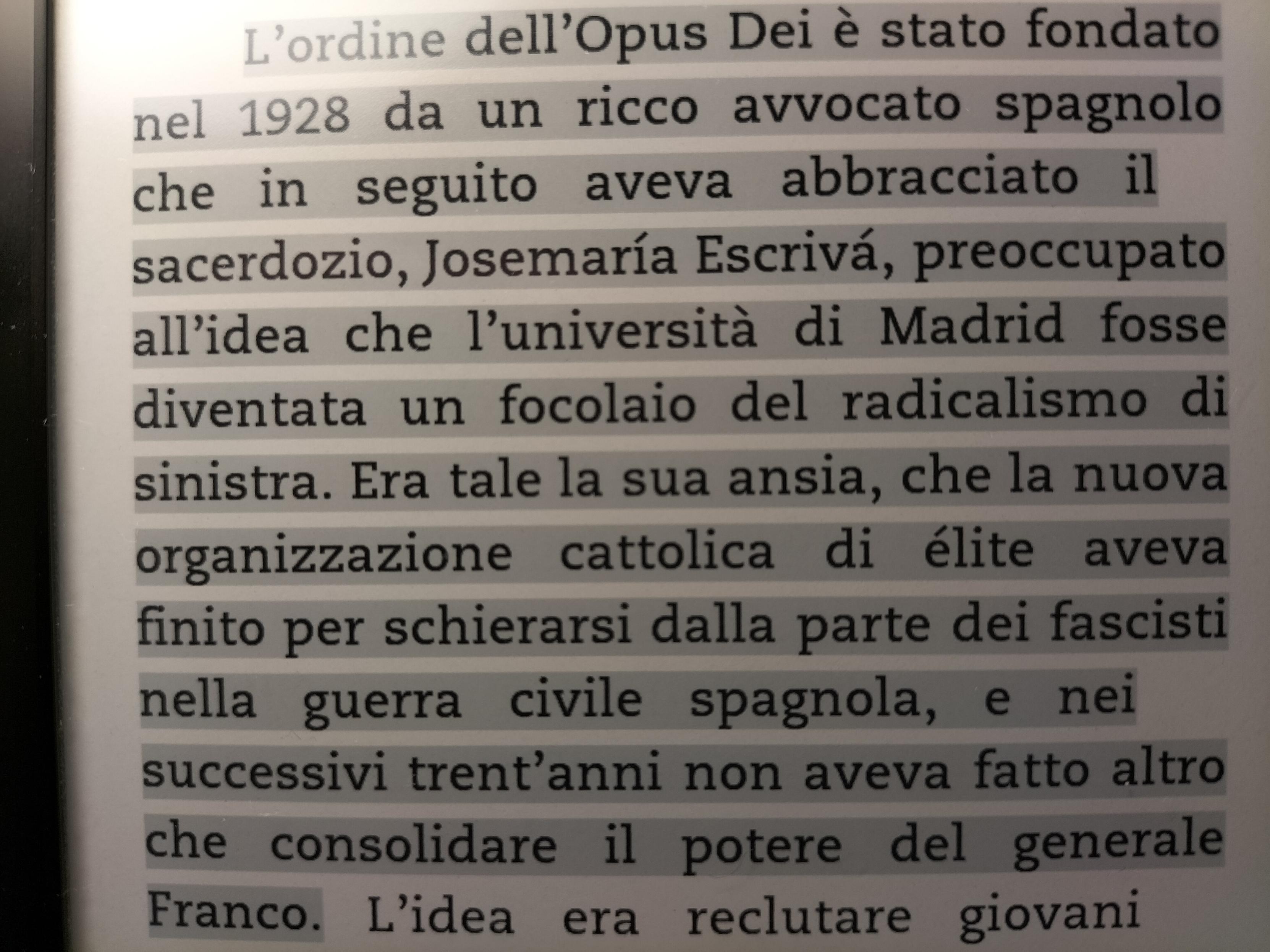 L'ordine dell'Opus Dei è stato fondato nel 1928 da un ricco avvocato spagnolo che in seguito aveva abbracciato il sacerdozio, Josemarìa Escrivà, preoccupato all'idea che l'università di Madrid fosse diventato un focolaio del radicalismo di sinistra. Era tale la sua ansia che la nuova organizzazione cattolica di élite aveva finito per schierarsi dalla parte dei fascisti nella guerra civile spagnola, e nei successivi 30 anni non aveva fatto altro che consolidare il potere del generale Franco.