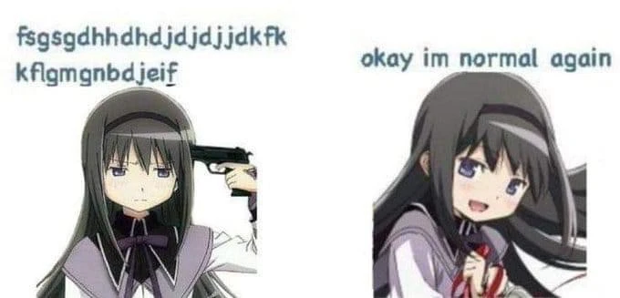 two panel picture showing 1. seemingly resigned homura (the deception scene from rebellion) pointing a gun at her head with caption: fsgsgdhhdhdjdjdjjdkfkkflgmgnbdjeif 2. homura seemingly happy, holding a red ribbon with caption: okay im normal again
