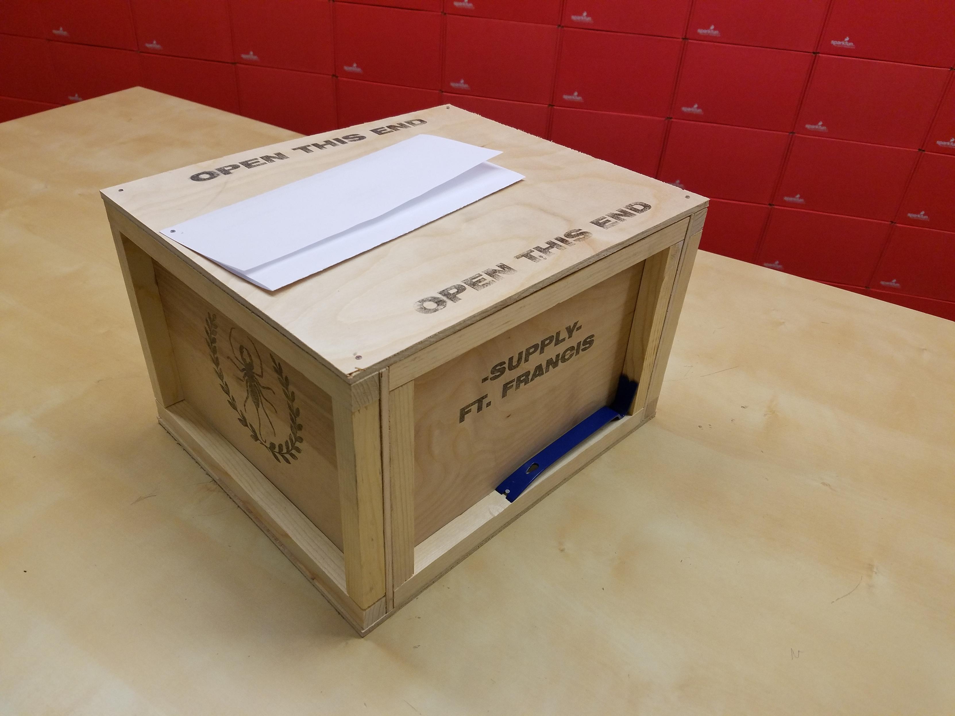 A small plywood crate with labels "Supply, Ft. Francis" and "Open this end" as well as an insignia of a vinegaroon in a wreath of laurels. A tiny crowbar is nestled in the side of the crate.