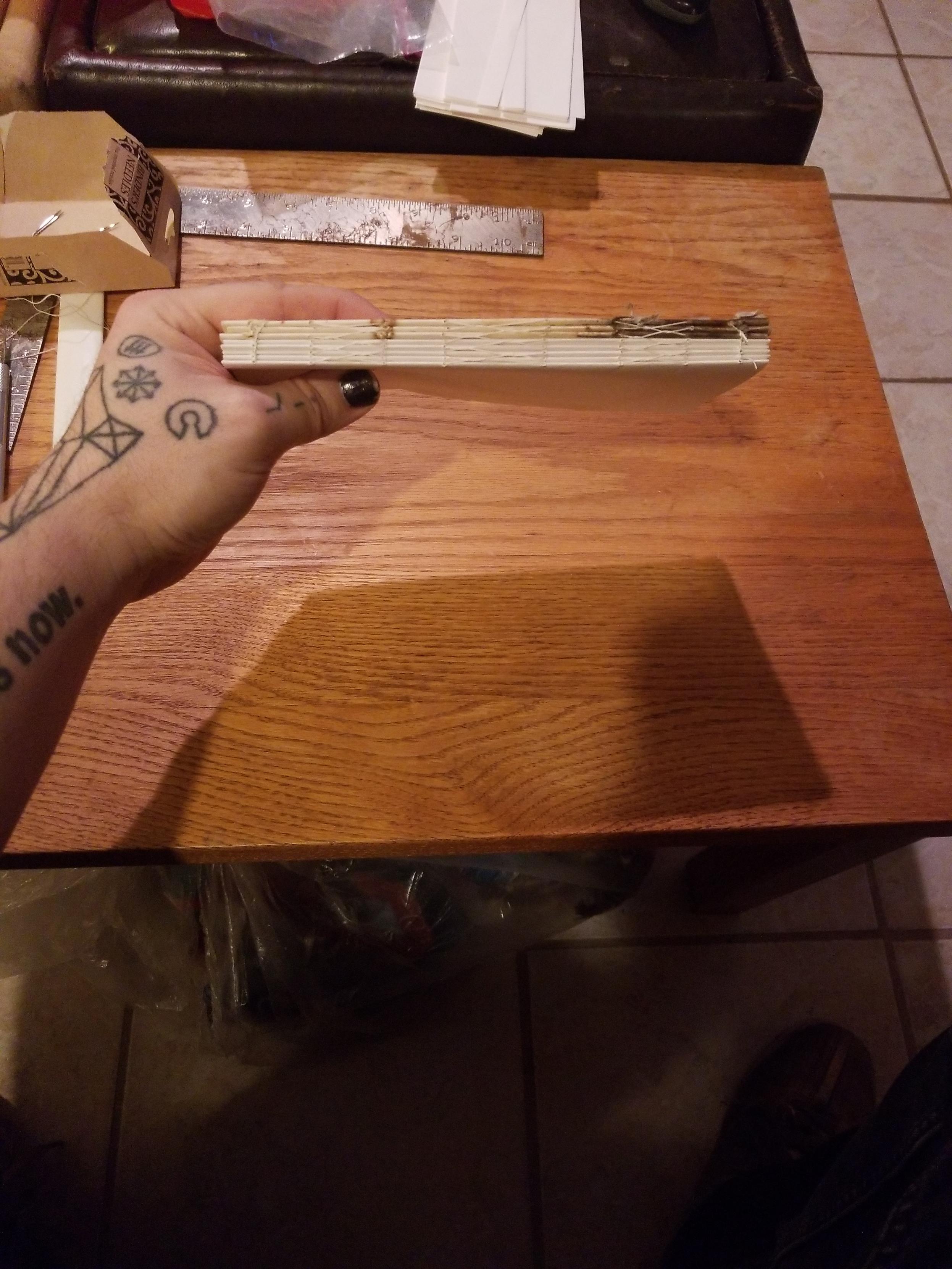 A collection of stitched signatures from the original journal with a stack of fresh signatures, stitched together and ready for binding