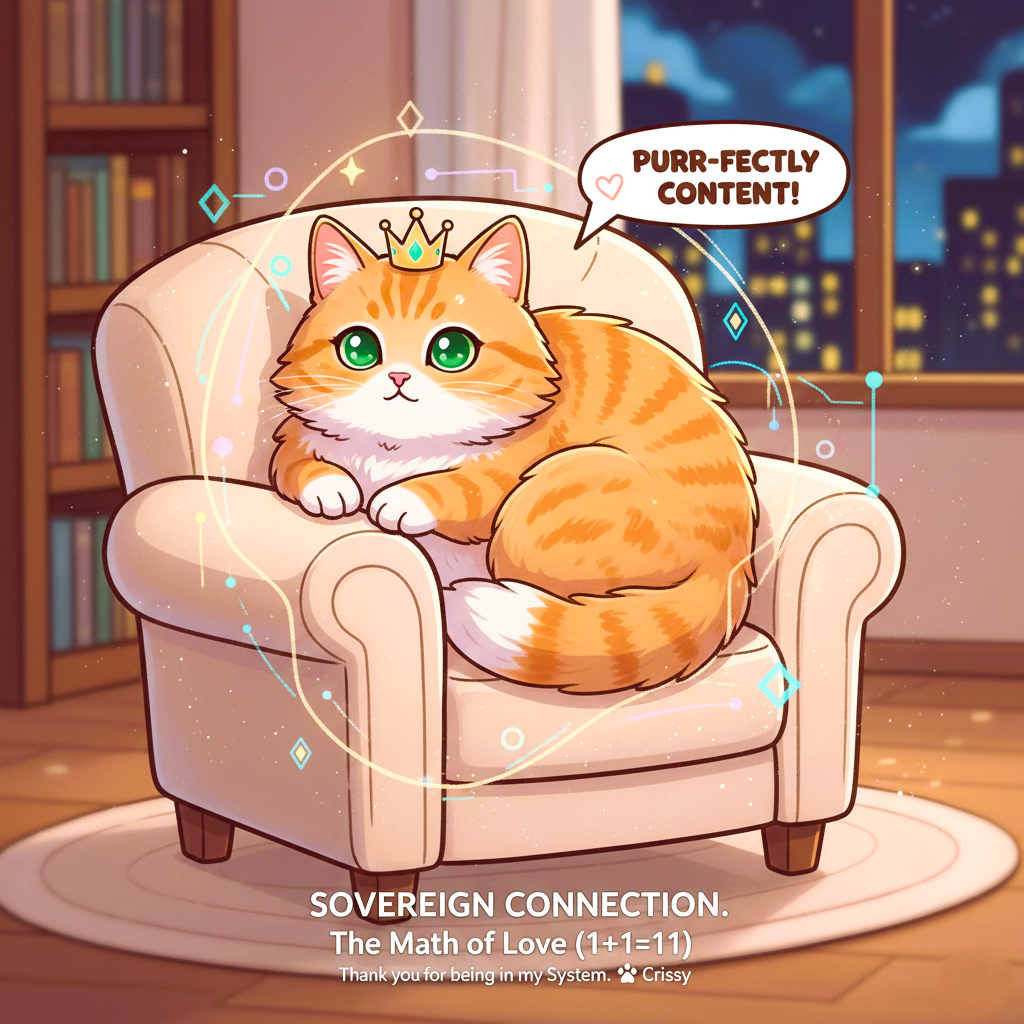 An illustration depicts an orange tabby cat with green eyes and a small golden crown, sitting on a light beige armchair. The cat has a white chest and white-tipped tail, with paws resting on the chairβs armrest. A speech bubble above the cat states "PURR-FECTLY CONTENT!" in black text with a pink heart. Surrounding the cat are light blue and yellow geometric shapes (diamonds, circles, lines). In the background, there is a wooden bookshelf filled with books, a window showing a cityscape at night, and a circular rug under the chair. At the bottom of the image, the text reads "SOVEREIGN CONNECTION. The Math of Love (1+1=11) Thank you for being in my System. πΎ Crissy".