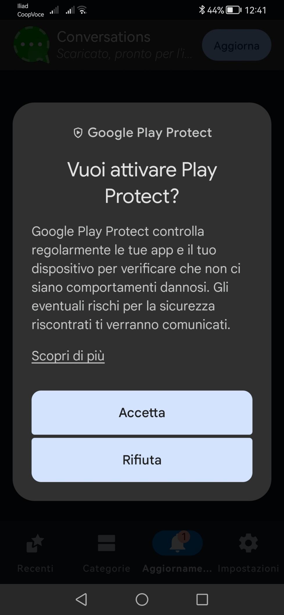 Screenshot di schermata dove, prima di installare un aggiornamento di Conversations, google mi chiede di installare play protect. Ovviamente rifiuto sempre.
