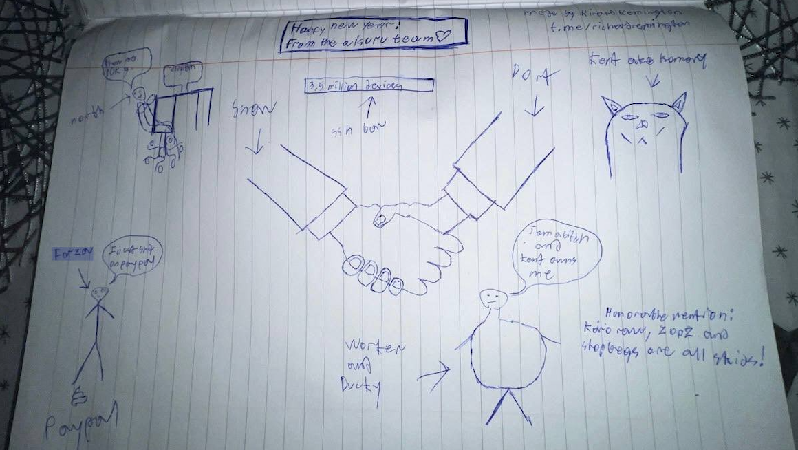 Hilariously, a user by the name “Richard Remington” briefly appeared in the group’s Telegram server to post a crude “Happy New Year” sketch that claims Dort and Snow are now in control of 3.5 million devices infected by Aisuru and/or Kimwolf. Richard Remington’s Telegram account has since been deleted, but it previously stated its owner operates a website that caters to DDoS-for-hire or “stresser” services seeking to test their firepower. The sketch is done in blue pen ink on a white composition notebook held sideways, so that the lines are vertical. If includes several childish stick figure drawings depicting people allegedly tied to Aisuru and Kimwolf, and in the center are two hands clasped, with one hand labeled "Snow" and the other "Dort."