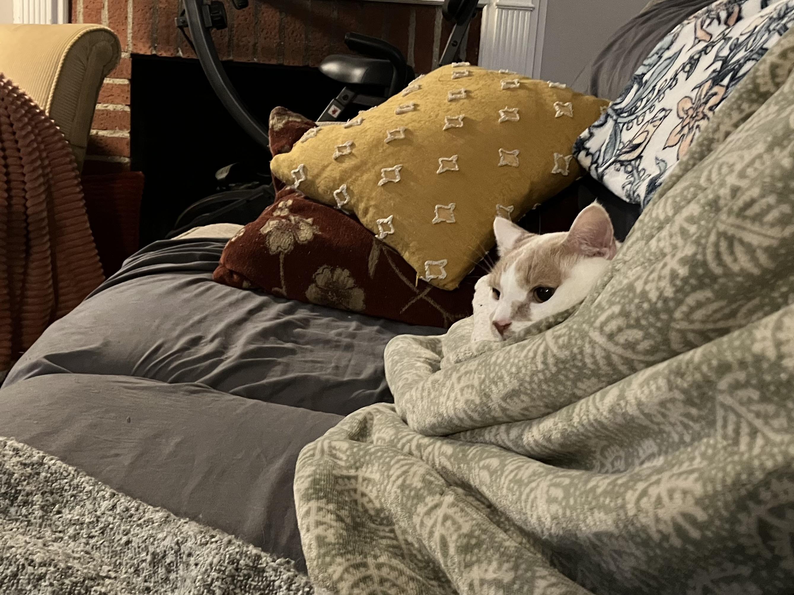 A peeved looking orange and white cat half wrapped in a soft green blanket. Only his little seething face is visible