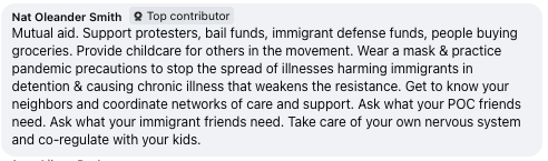 Facebook comment by Nat Oleander Smith Mutual aid. Support protesters, bail funds, immigrant defense funds, people buying groceries. Provide childcare for others in the movement. Wear a mask & practice pandemic precautions to stop the spread of illnesses harming immigrants in detention & causing chronic illness that weakens the resistance. Get to know your neighbors and coordinate networks of care and support. Ask what your POC friends need. Ask what your immigrant friends need. Take care of your own nervous system and co-regulate with your kids.