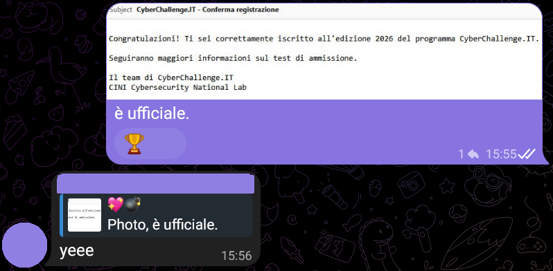 CyberChallenge.IT - Conferma registrazione Congratulazioni! Ti sei correttamente iscritto all'edizione 2026 del programma CyberChallenge.IT. Seguiranno maggiori informazioni sul test di ammissione. Il team di CyberChallenge.IT CINI Cybersecurity National Lab ๐๐ฃ, [23/01/2026 15:55] รจ ufficiale. [...], [23/01/2026 15:56] yeee