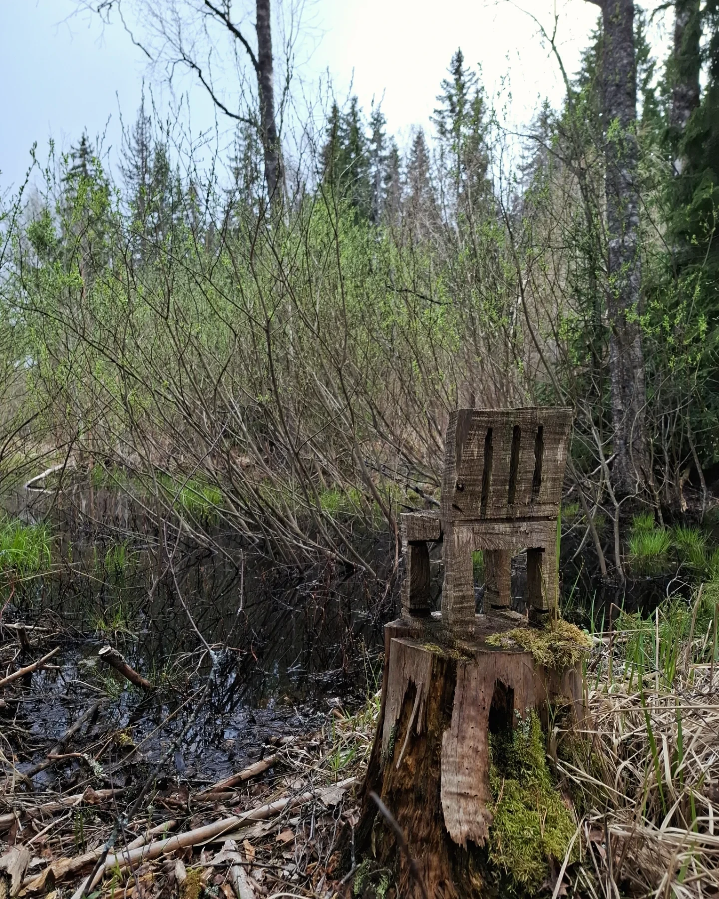 Pieni puinen tuoli kannon pรครคllรค lammikon rannalla.
