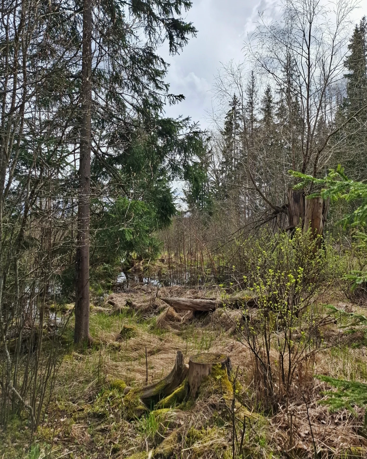 Lampi metsΓ€n ja pellon reunassa. Pusikkoa, puita ja kantoja.