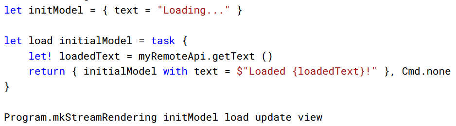let initModel = { text = "Loading..." } let load initialModel = task { let! loadedText = myRemoteApi.getText () return { initialModel with text = $"Loaded {loadedText}!" }, Cmd.none } Program.mkStreamRendering initModel load update view