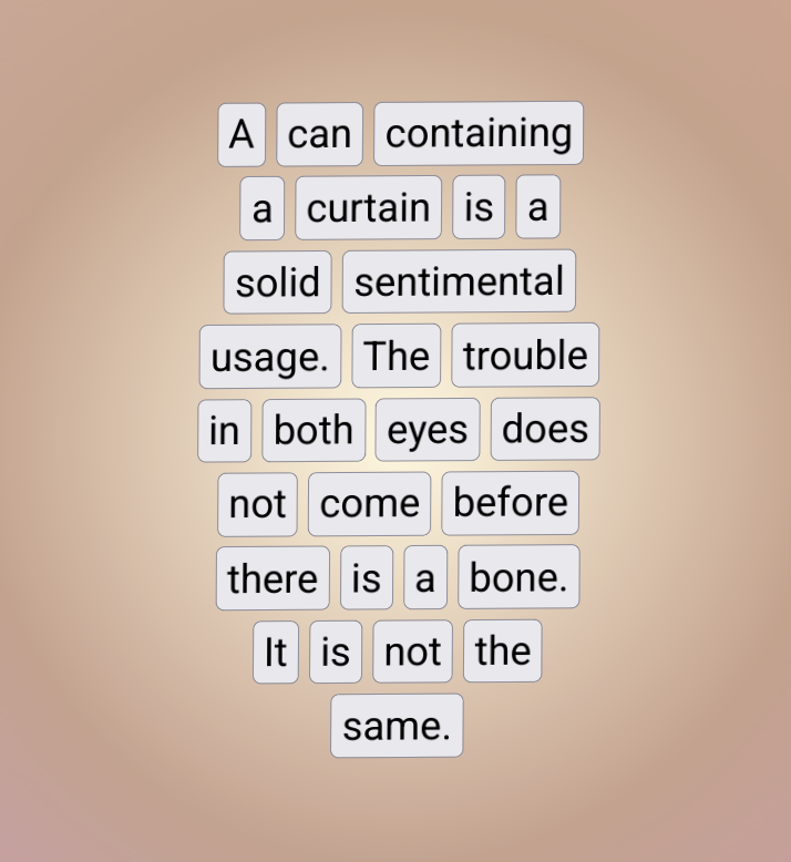 "A can containing a curtain is a solid sentimental usage. The trouble in both eyes did not come before there is a bone. It is not the same."