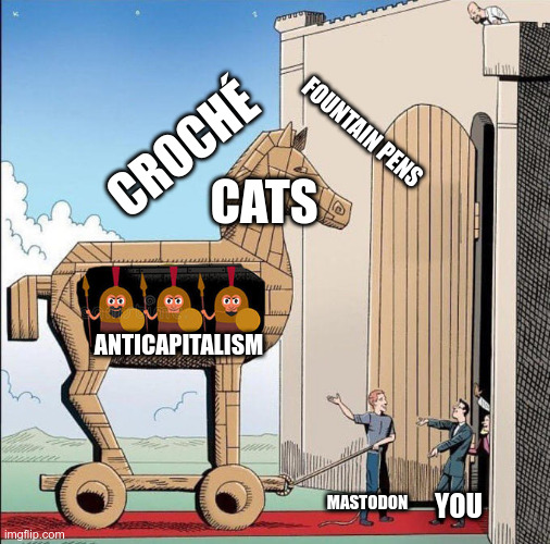 A Trojan horse meme about Mastodon. While topics such as crochet, fountain pens and cats are presented on the outside, anticapitalism is to be found on the inside.